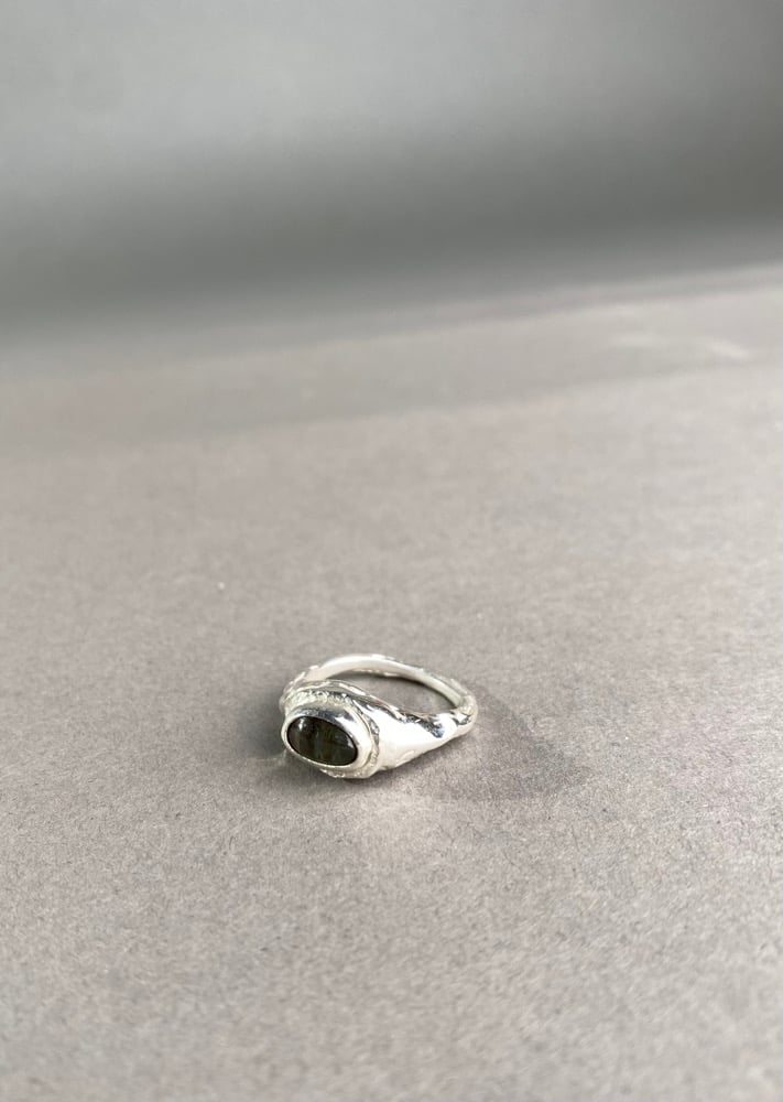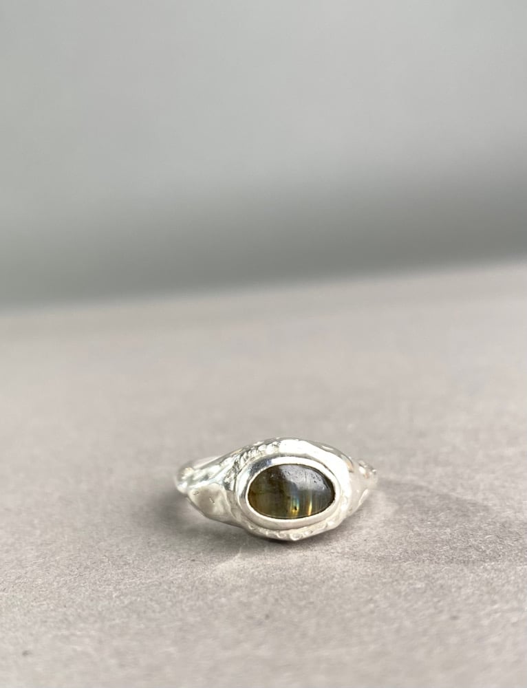 925 sterling silver ring handmade using the lost wax casting method. Chunky, rugged textures and asymmetric stone set design with a labradorite cabochon embedded in the design.