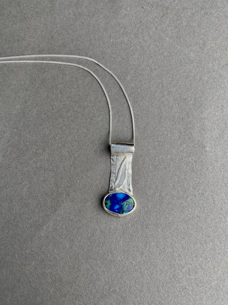 Azurite Stone set one of a kind design pendant with scrap silver layering and hammered textures with twisted loop style hook and 18'' curb chain.