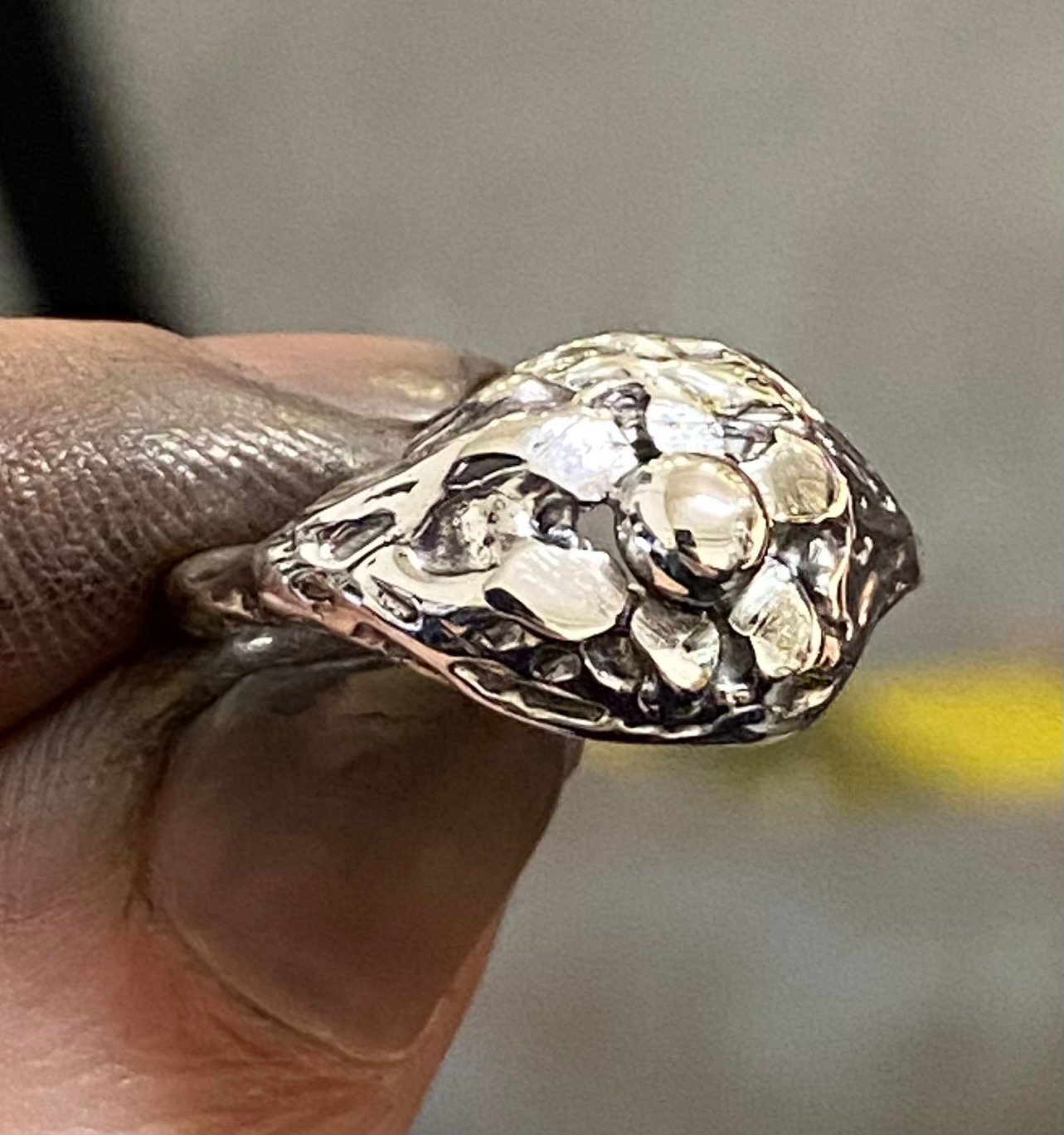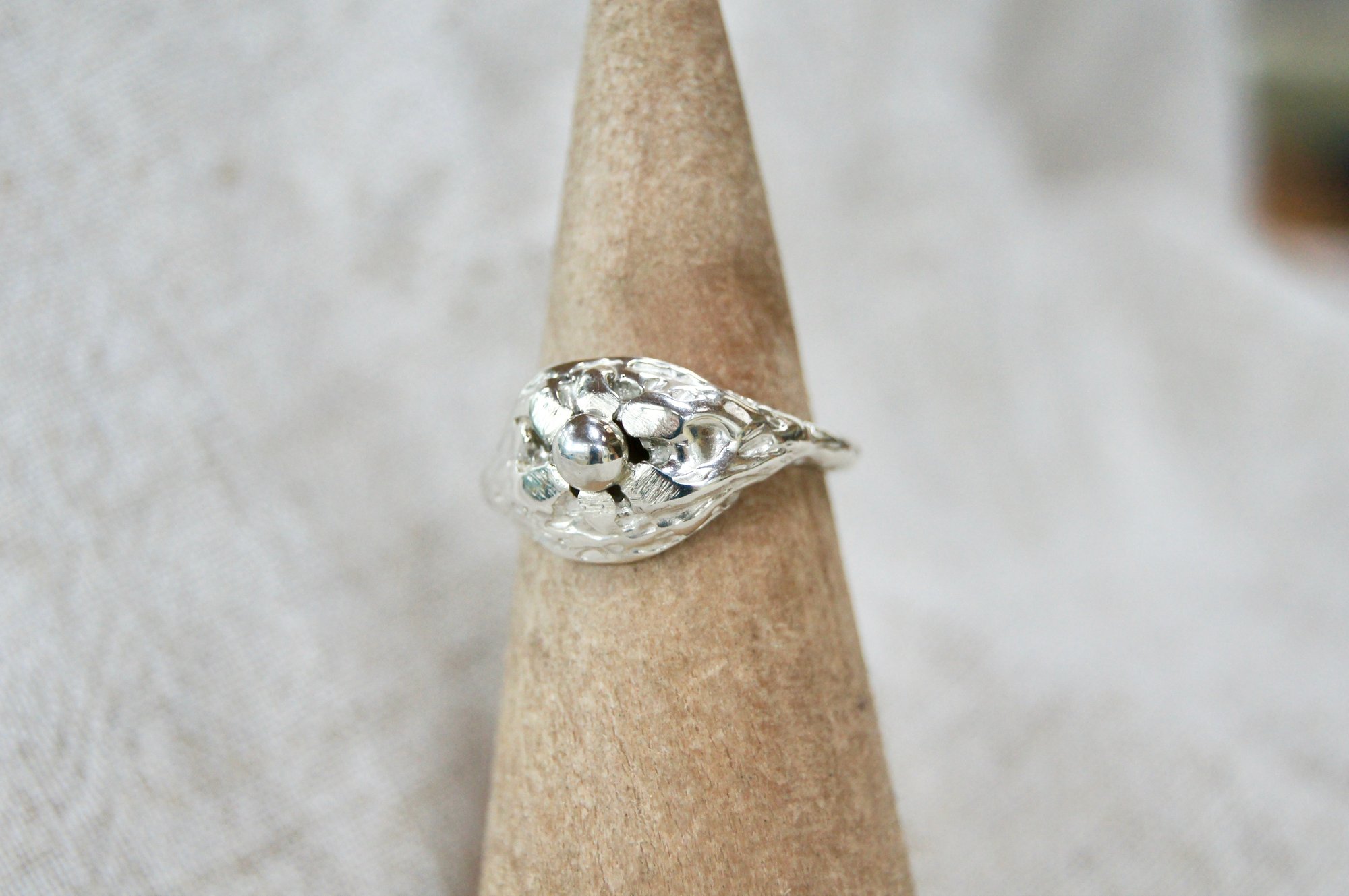 Waxed carved flower ring cast into sterling silver
