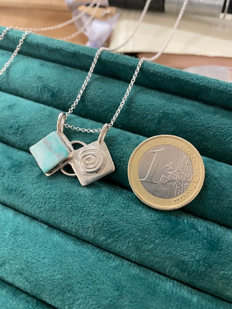 Handmade 925 sterling silver pendant with square flat turquoise stone , spiral, and circular back detailing - w/ a 18’’ belcher chain