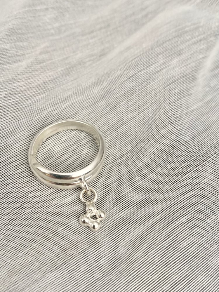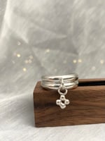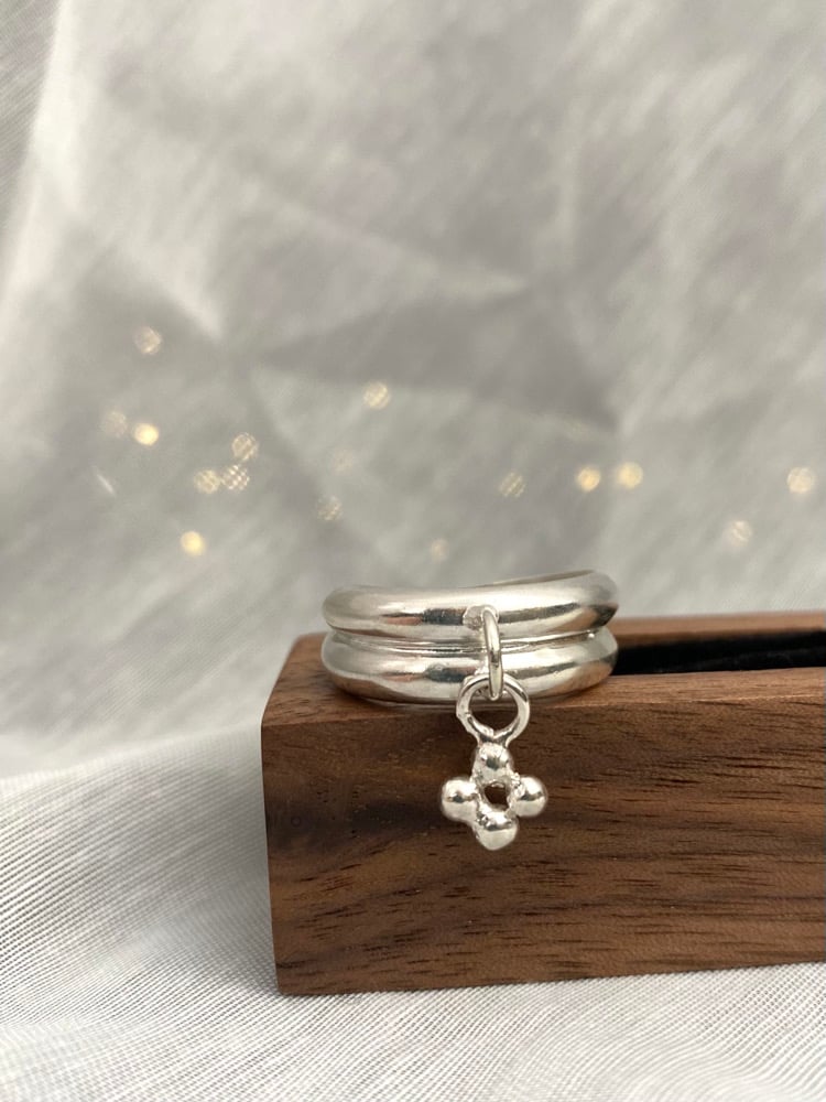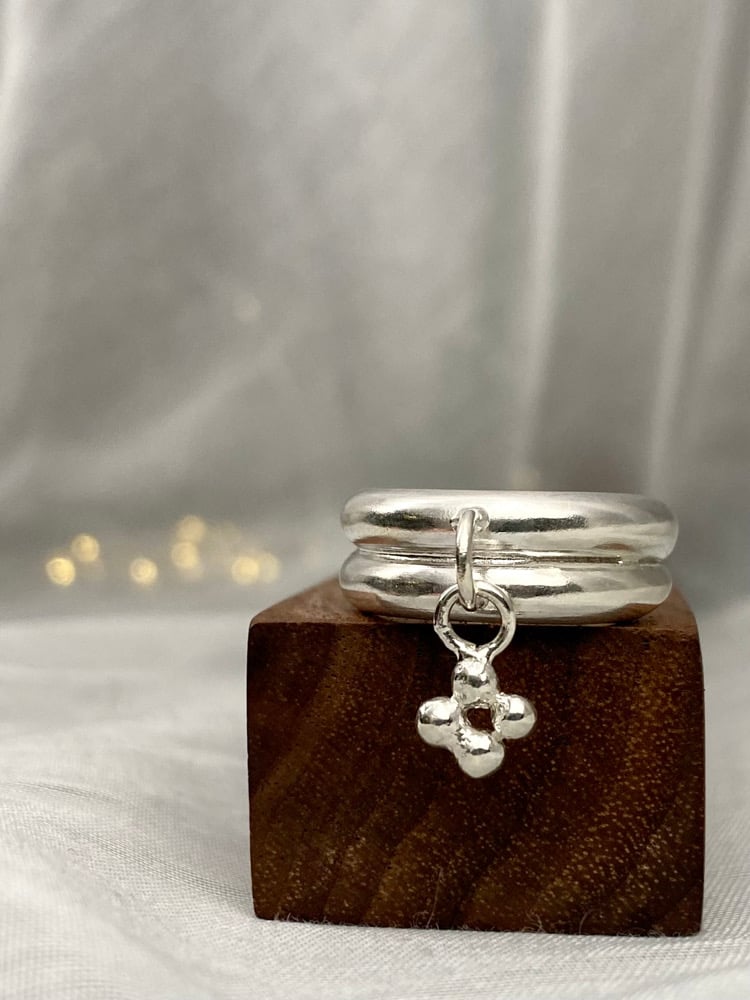 ‘Charmed’ - Thick handmade with precious 925 sterling silver D-shape double shank band with hanging charm resembling a small flower - made from off-cuts of scrap silver and hand-soldered jump rings.