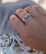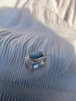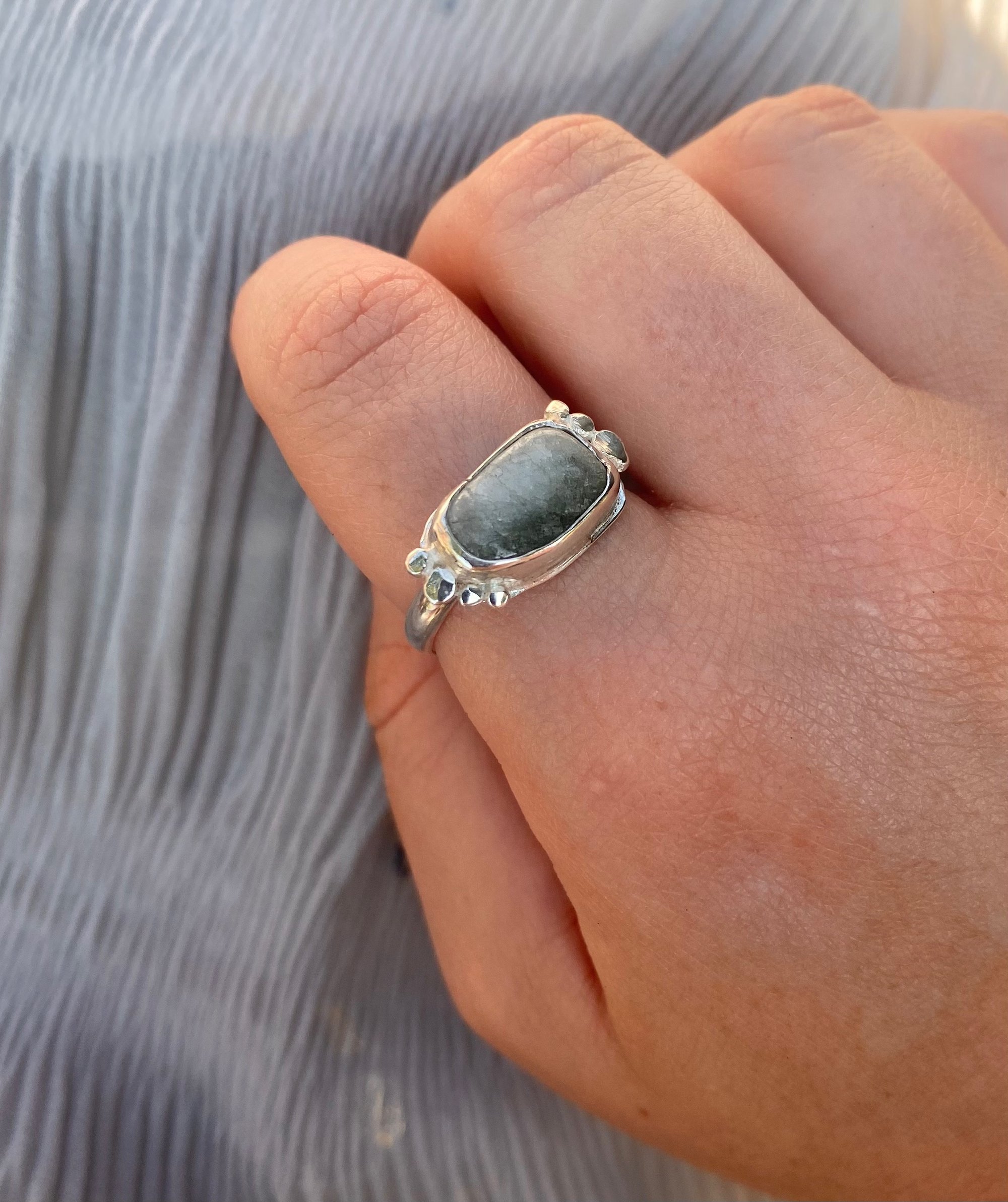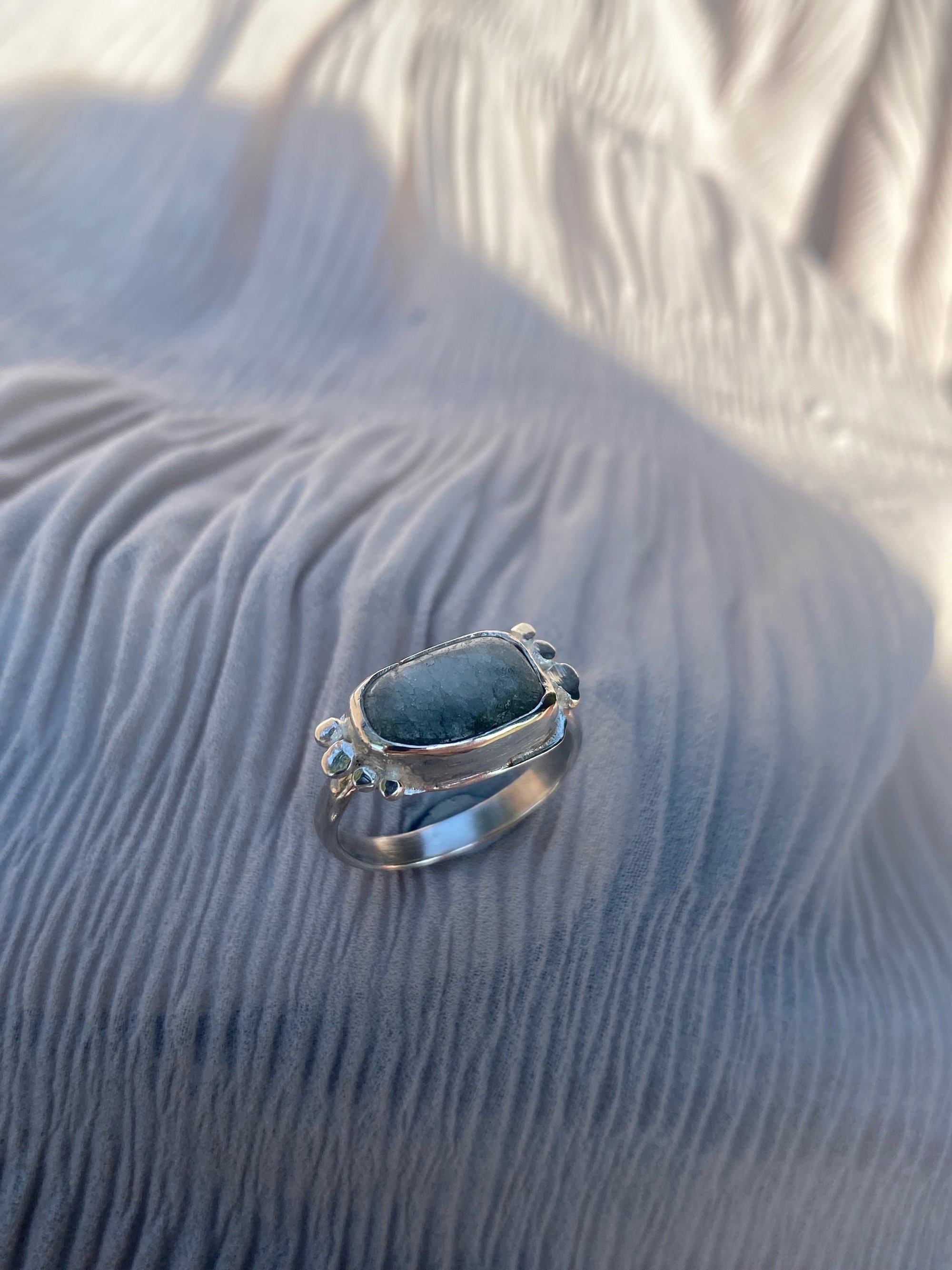 Once-off handmade design 925 sterling silver with silver ball texture on each side of crackle quartz bezel set ring with chunky band.