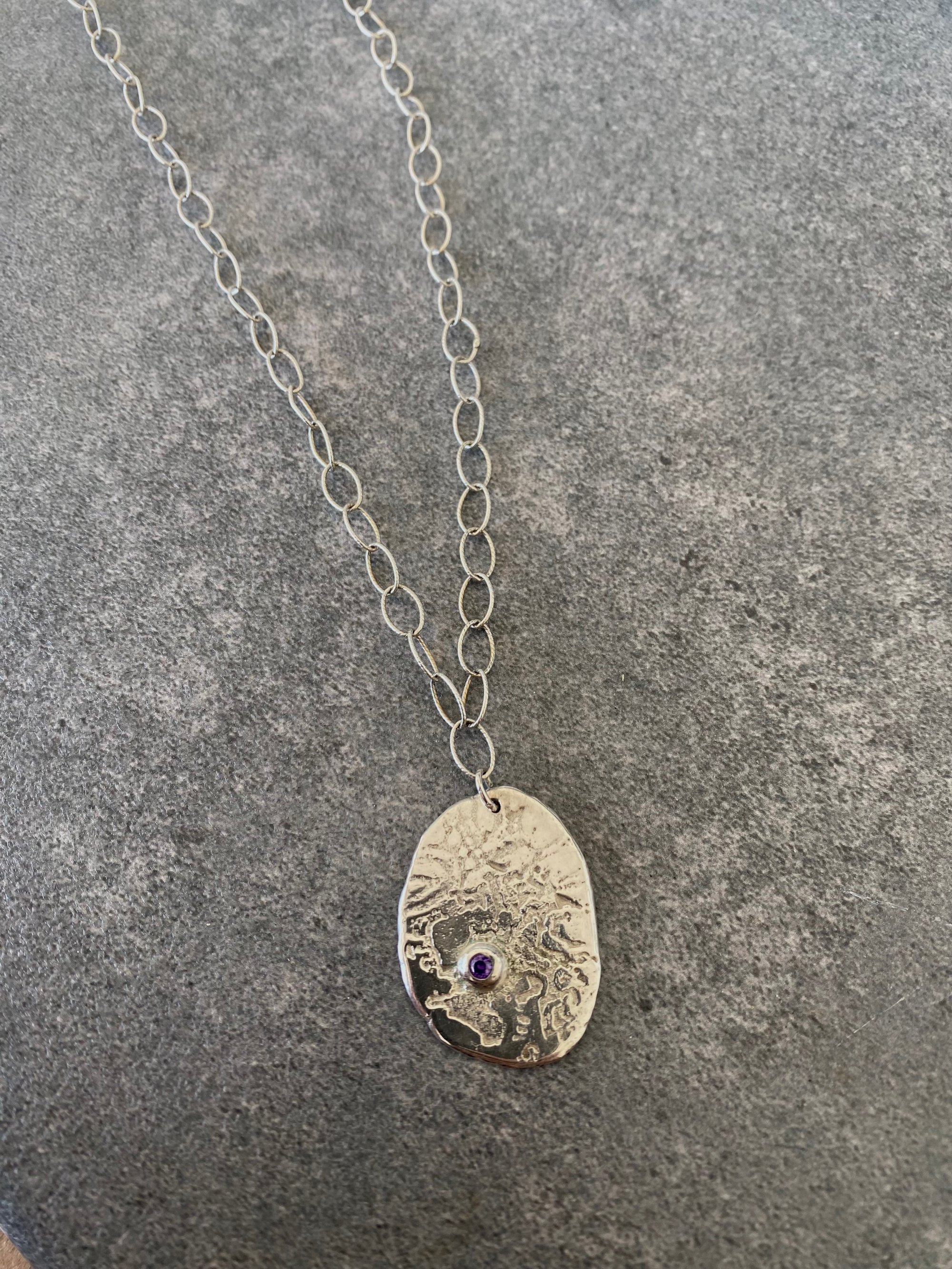 One of a kind 925 sterling silver pendant decorated in a unique etched ornate design with a flush setting of a deep purple cubic zirconia. With 18'' sterling silver curb chain or wide link chain (specify in note at checkout)