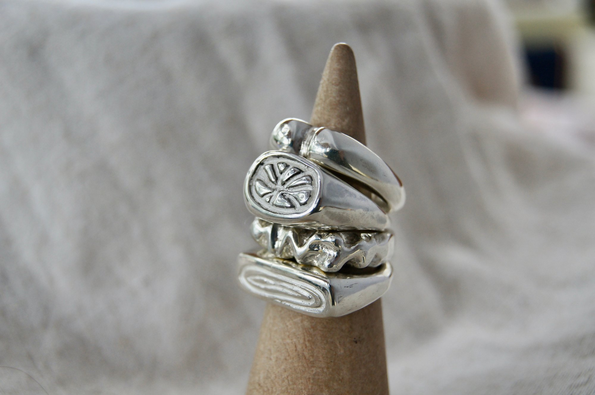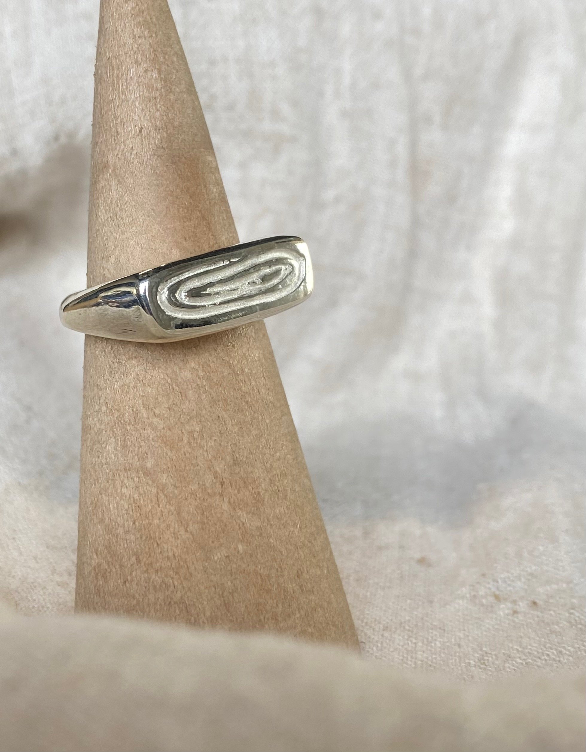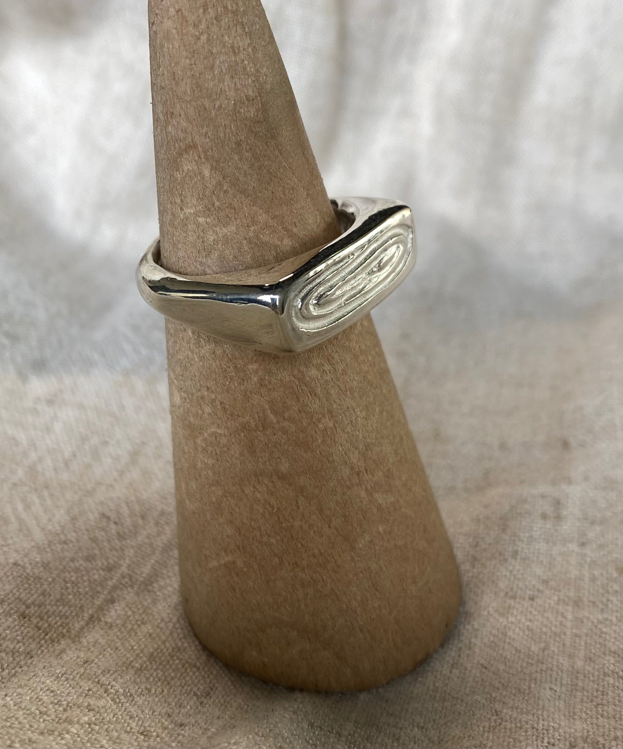 Wax carved rectangle signet style ring cast in 925 Sterling silver with a wooden ethereal carved pattern texture.