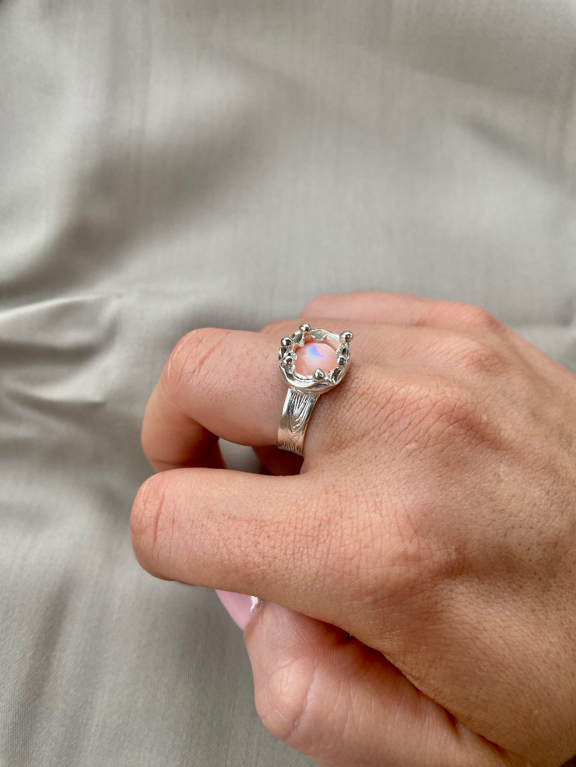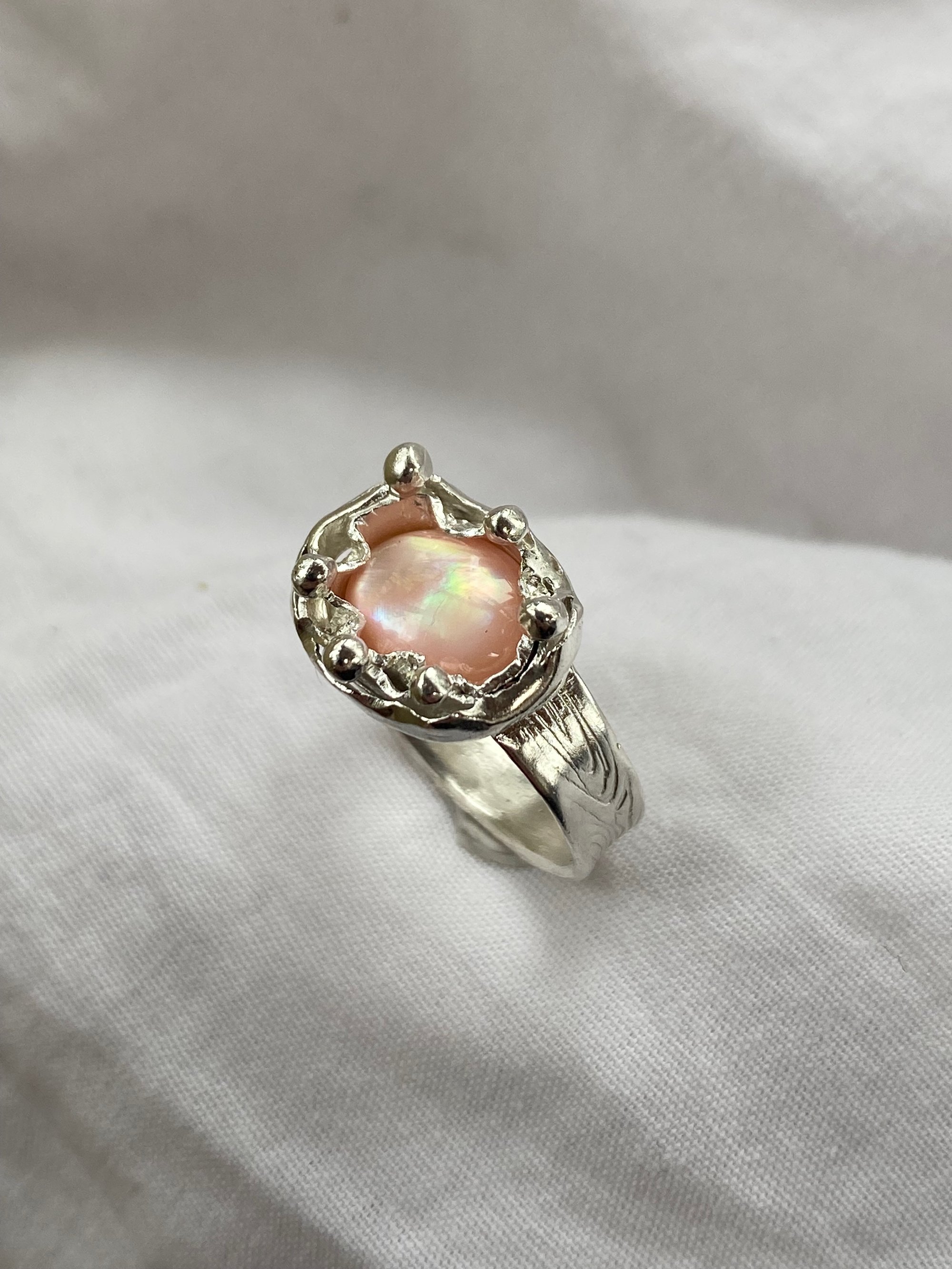 One of a kind mother of pearl uniquely set in a crown/droplet style bezel set accompanied by an etched 925 sterling silver band resembling organic ripples or tree bark.