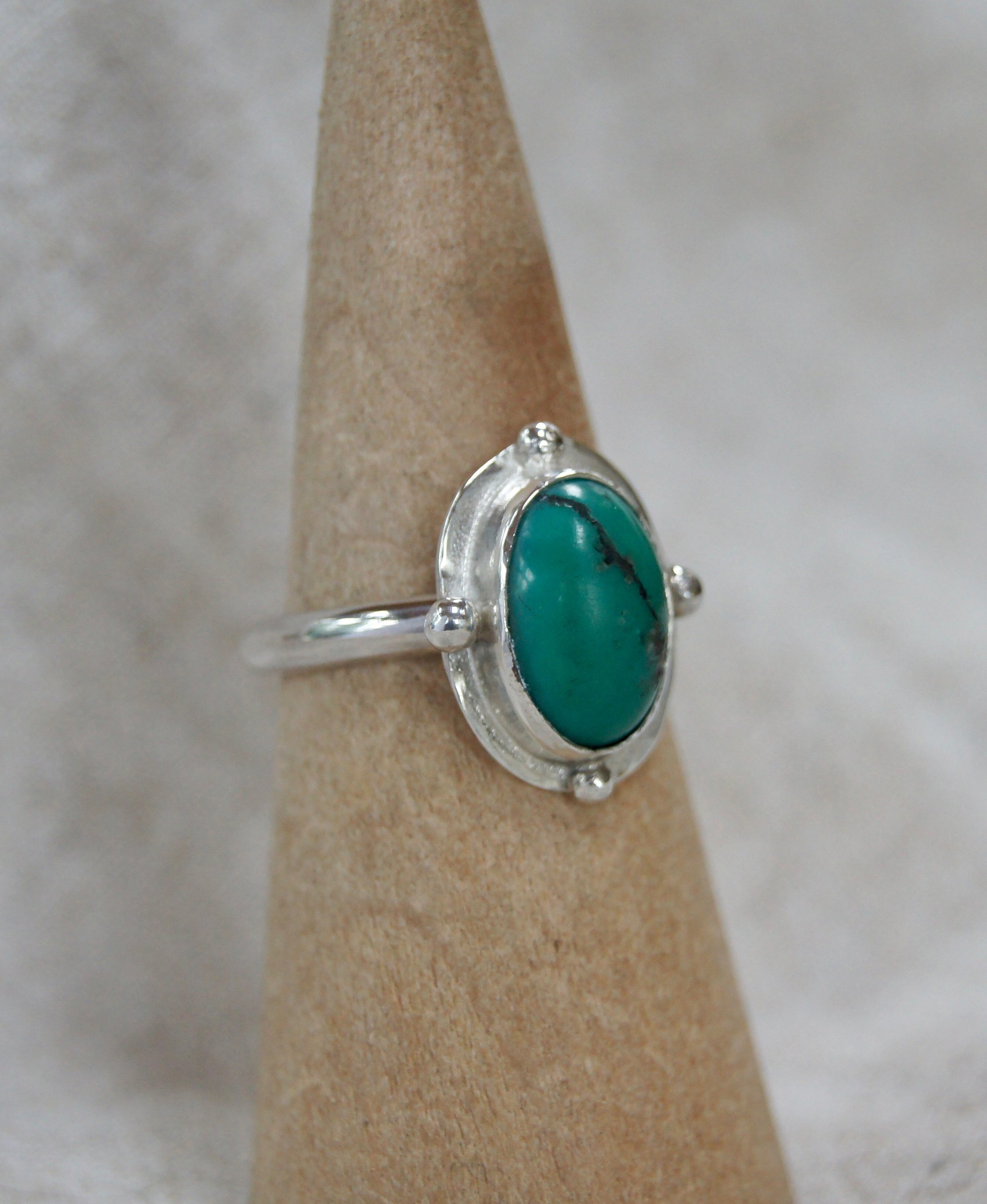 925 sterling silver handmade ring with d-shape shank and turquoise bezel set.