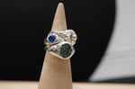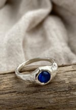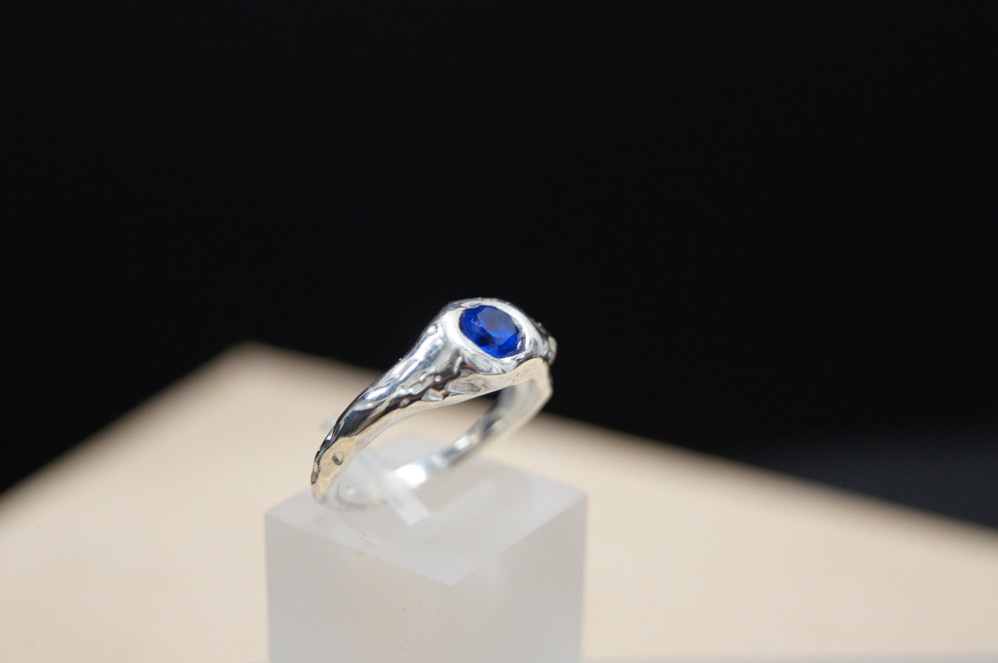 Wax carved ring casted into sterling silver with embedded Sapphire flush setting.
