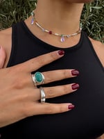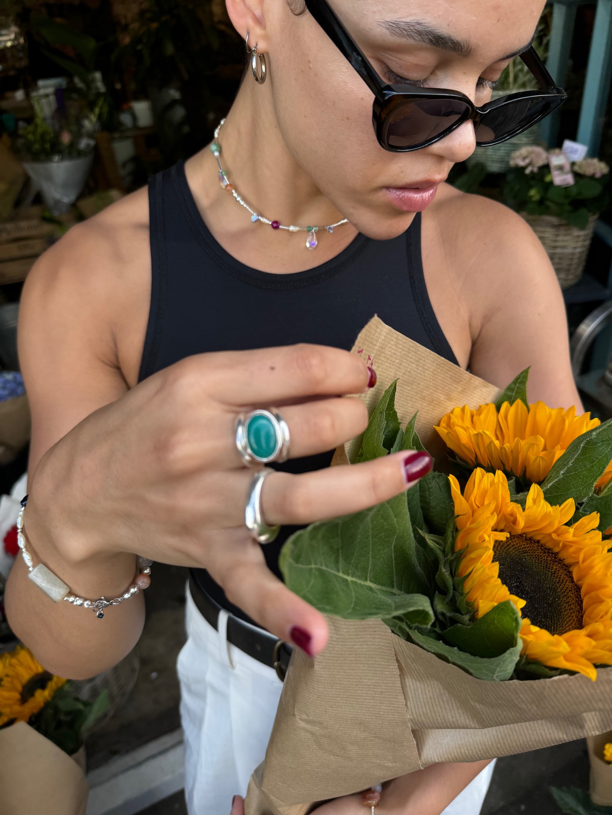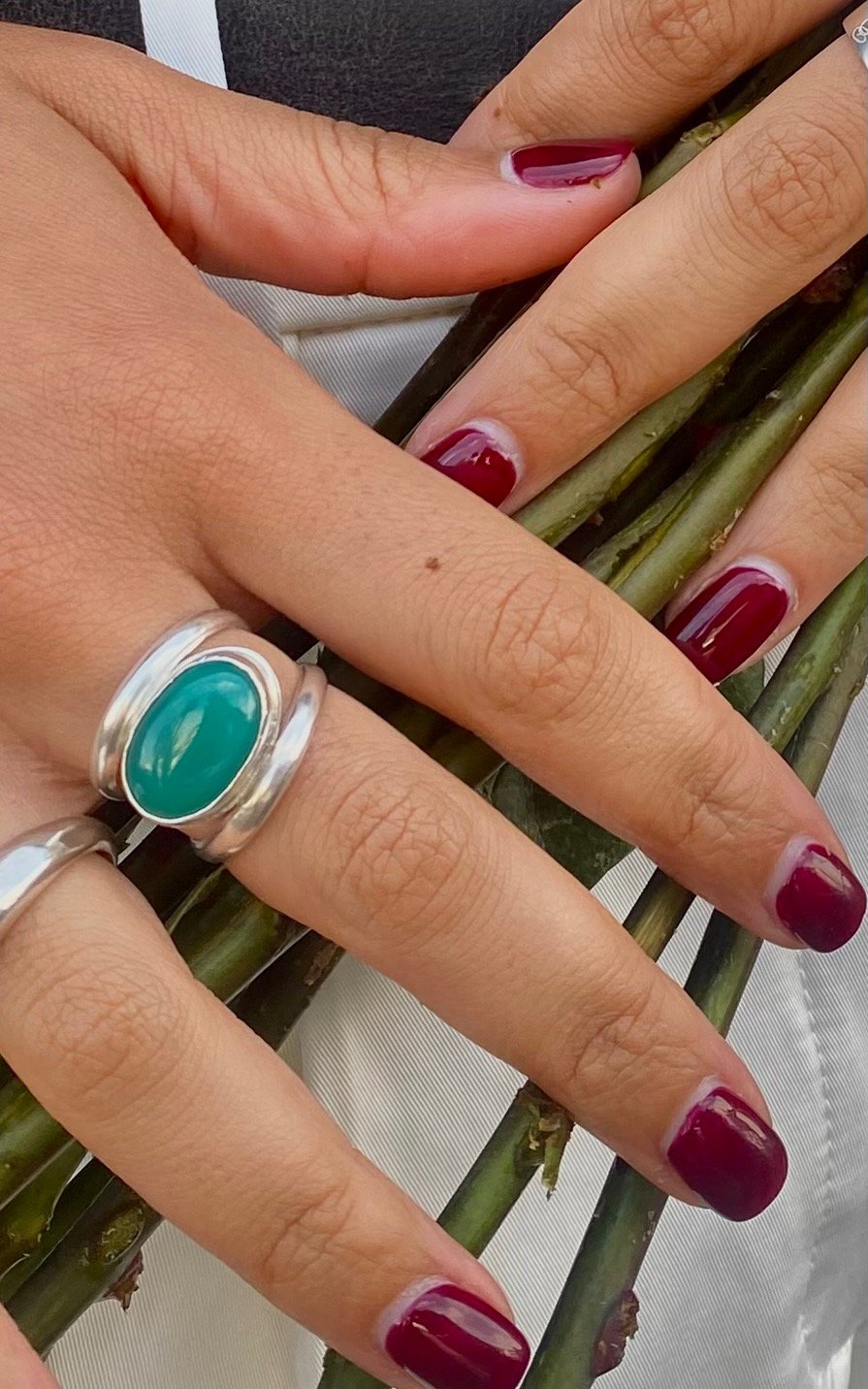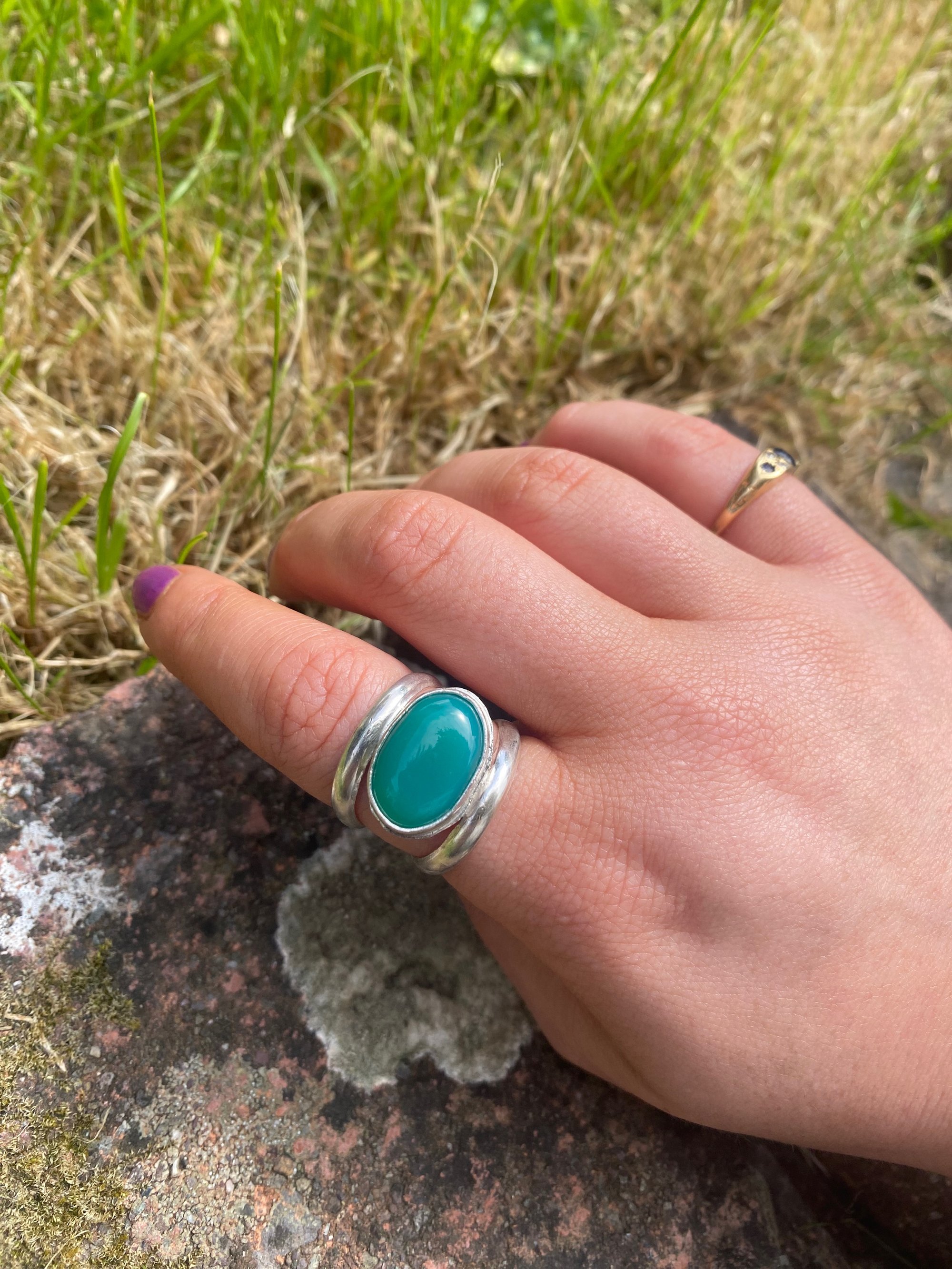 Chunky double shank/band sterling silver ring. 925 silver w/ green chalcedony gemstone set.