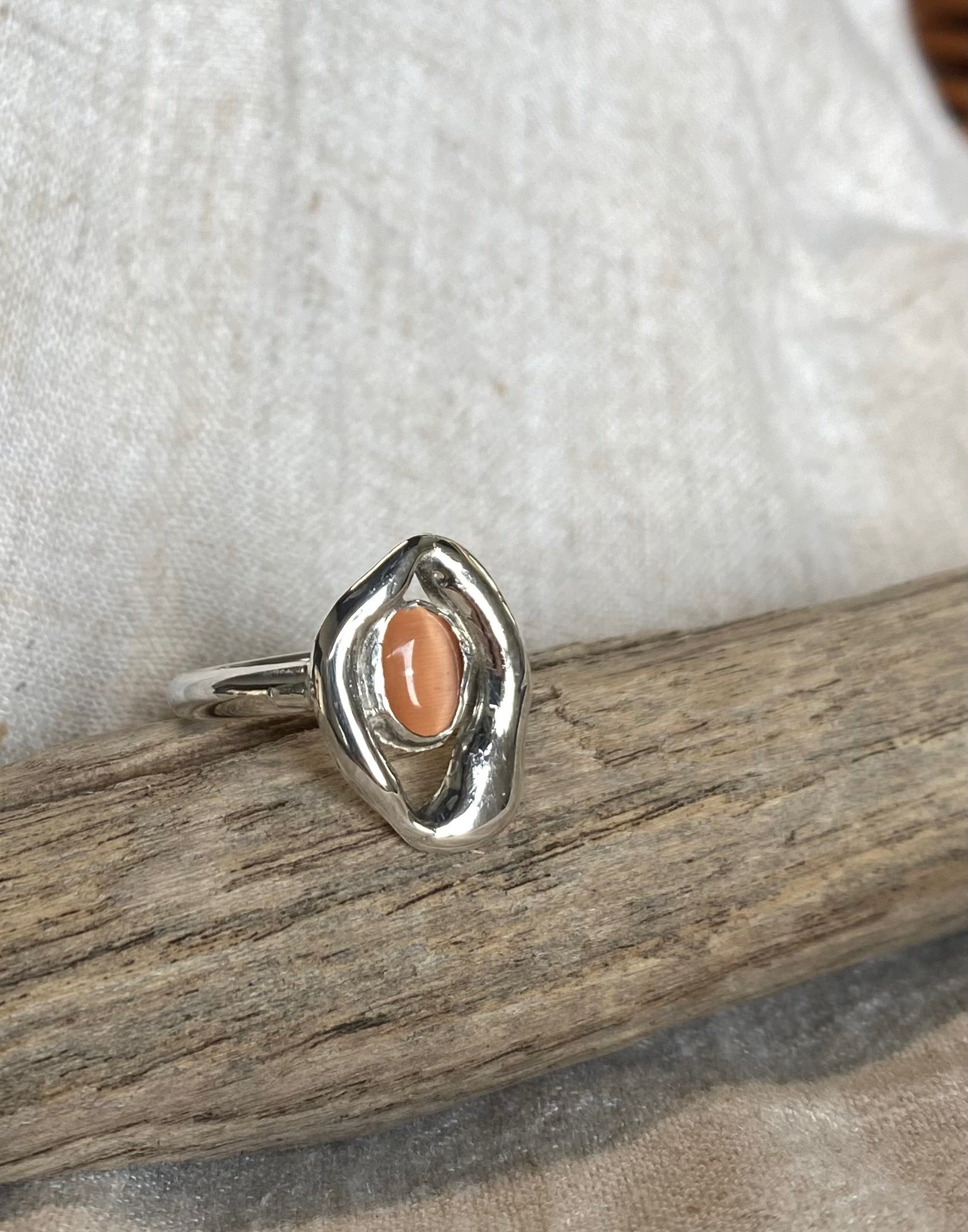 Handmade 925 sterling silver oval Cat Eye glass bezel set ring with thick D shape shank and liquid 'O' design face.