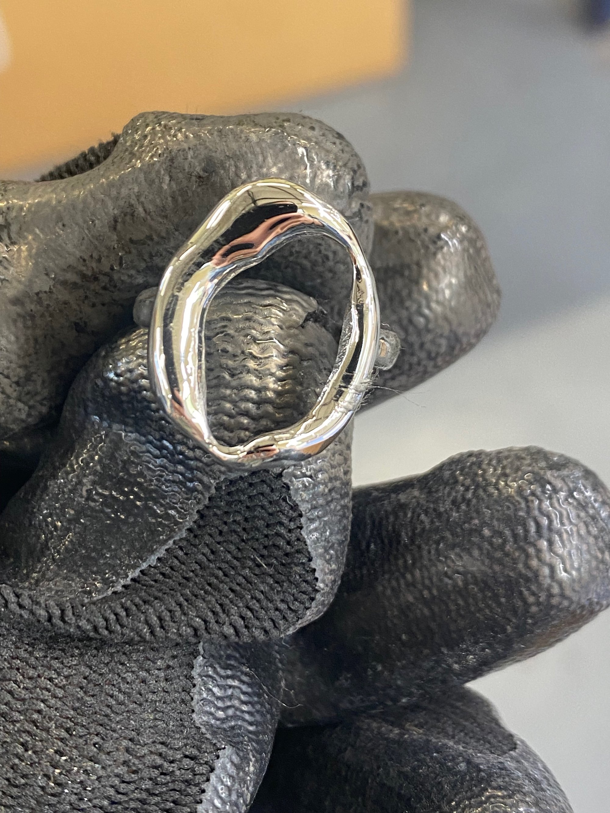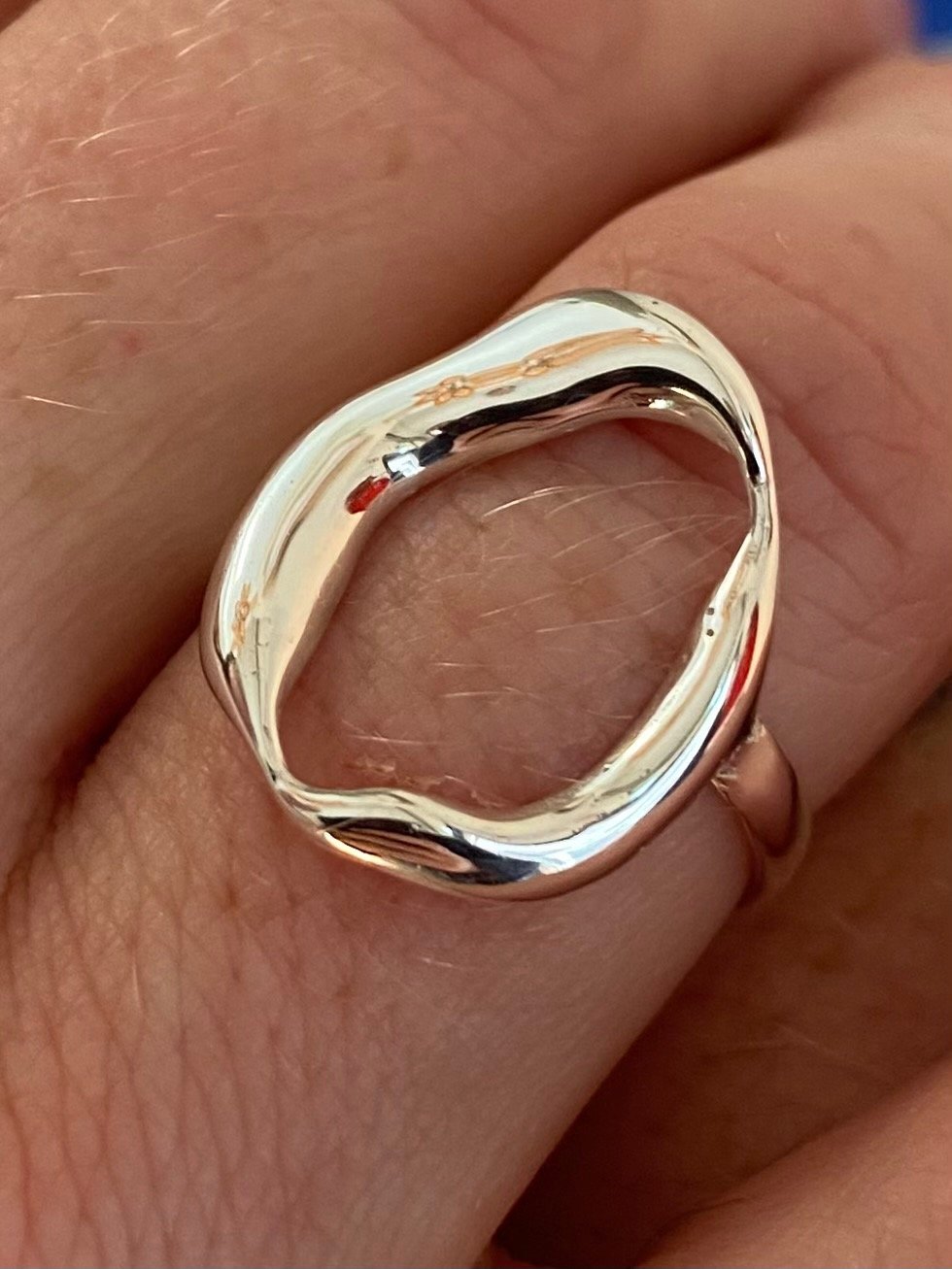 925 sterling silver liquid 'o' ring the original design. Fluid shape achieved with reticulation of silver to the point of melting until desired form.