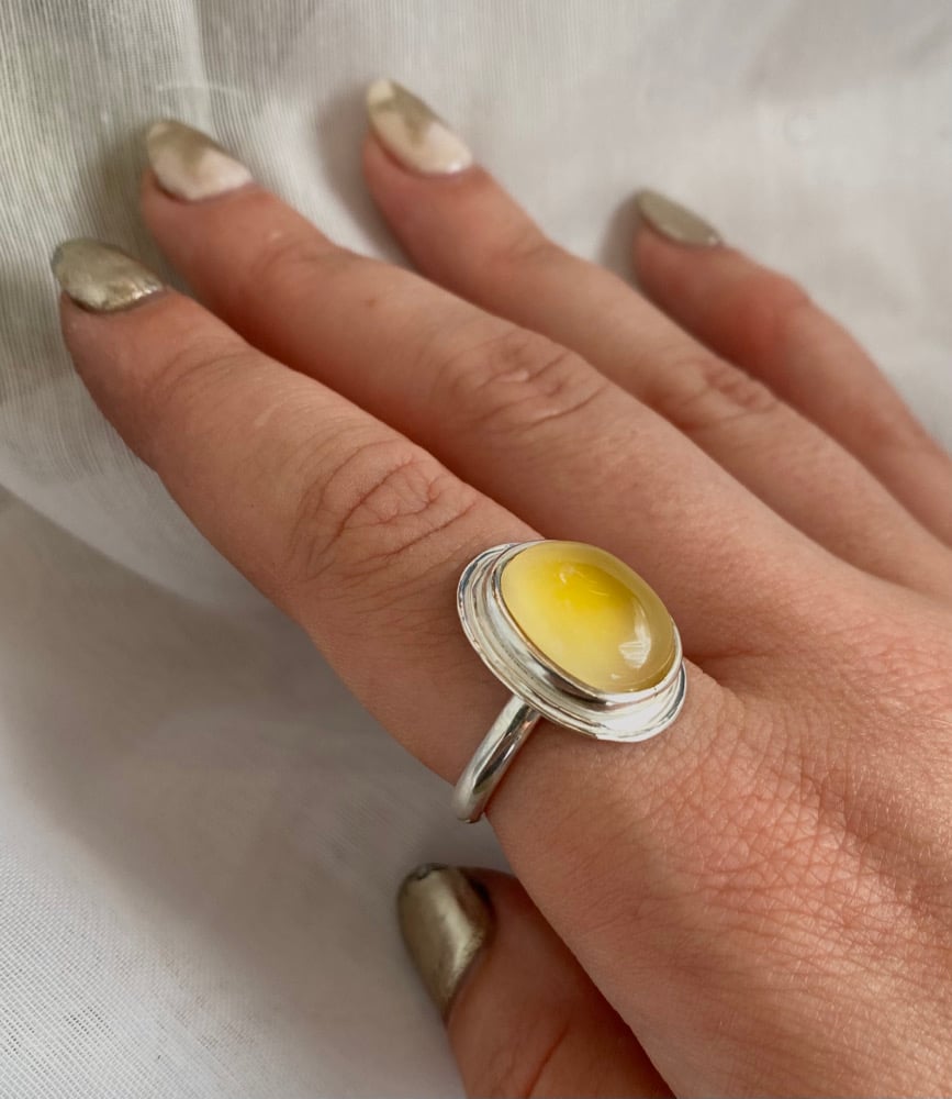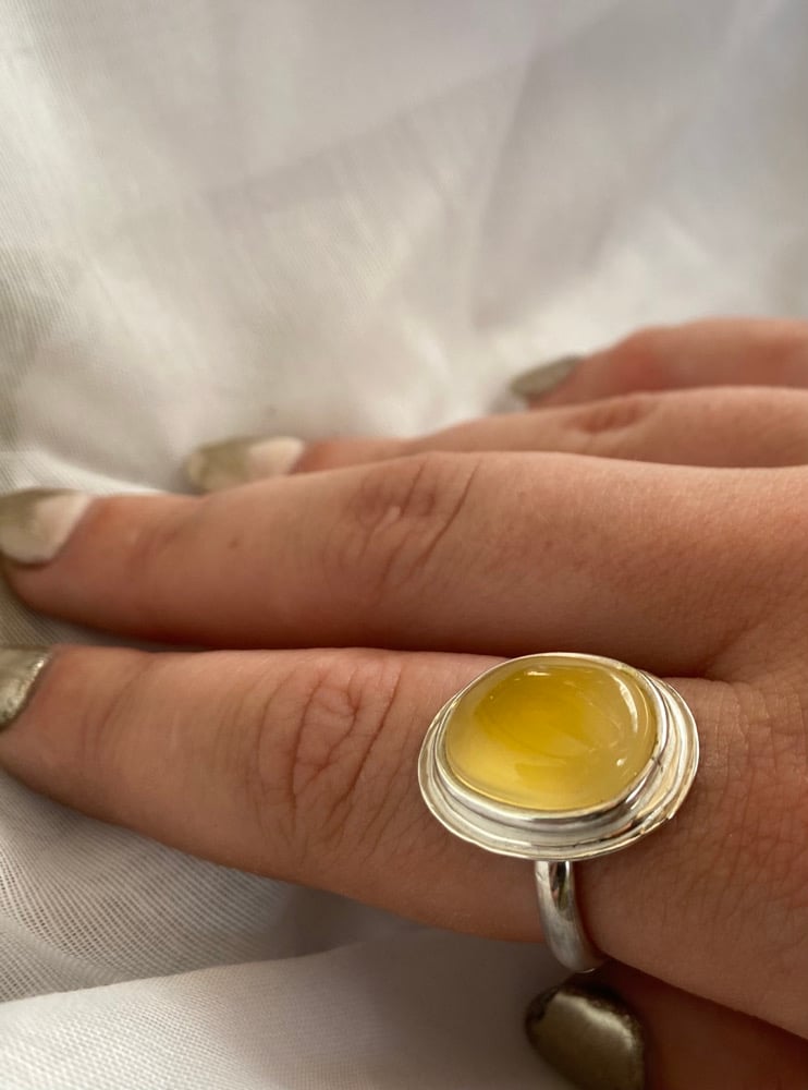 Vibrant sunshine yellow Agate gemstone set 925 sterling silver layered back plate and thick D shape shank (band)