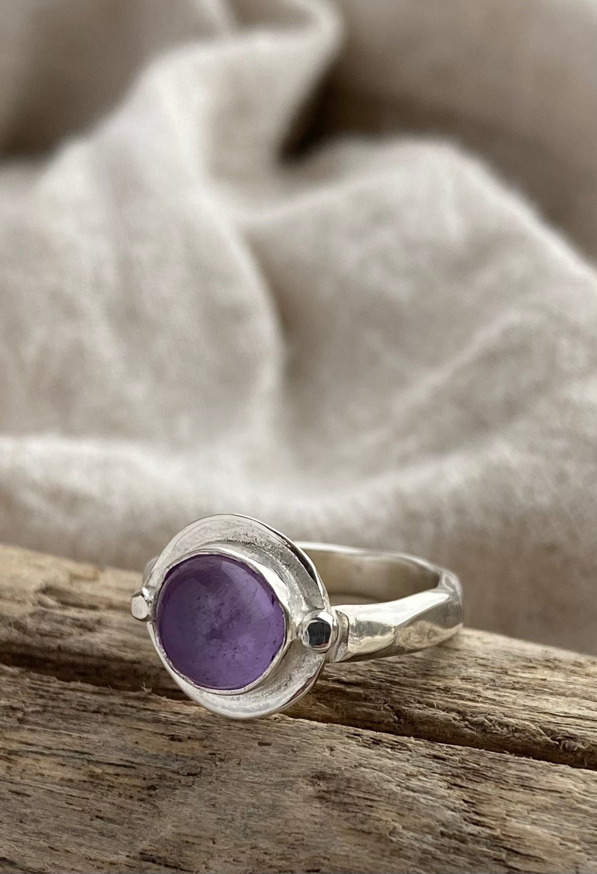 Handmade sterling silver synchronised hammered texture band with amethyst bezel set.