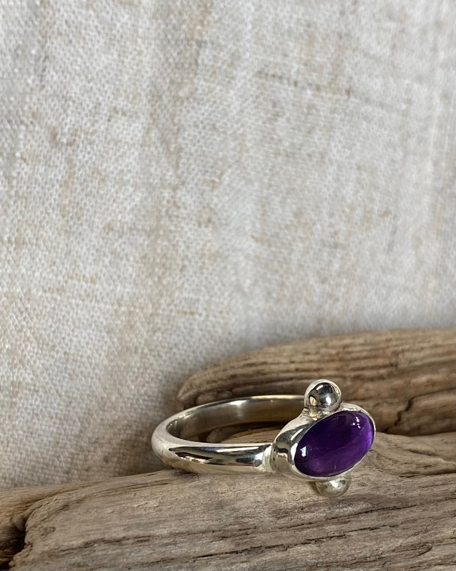 Handmade D-shaped 925 sterling silver ring with oval Amethyst bezel set.
