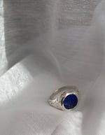 Heavy duty fluid design resembling molten silver with a circular lapis lazuli embedded in a signet style design of sterling silver using the wax to silver casting technique.