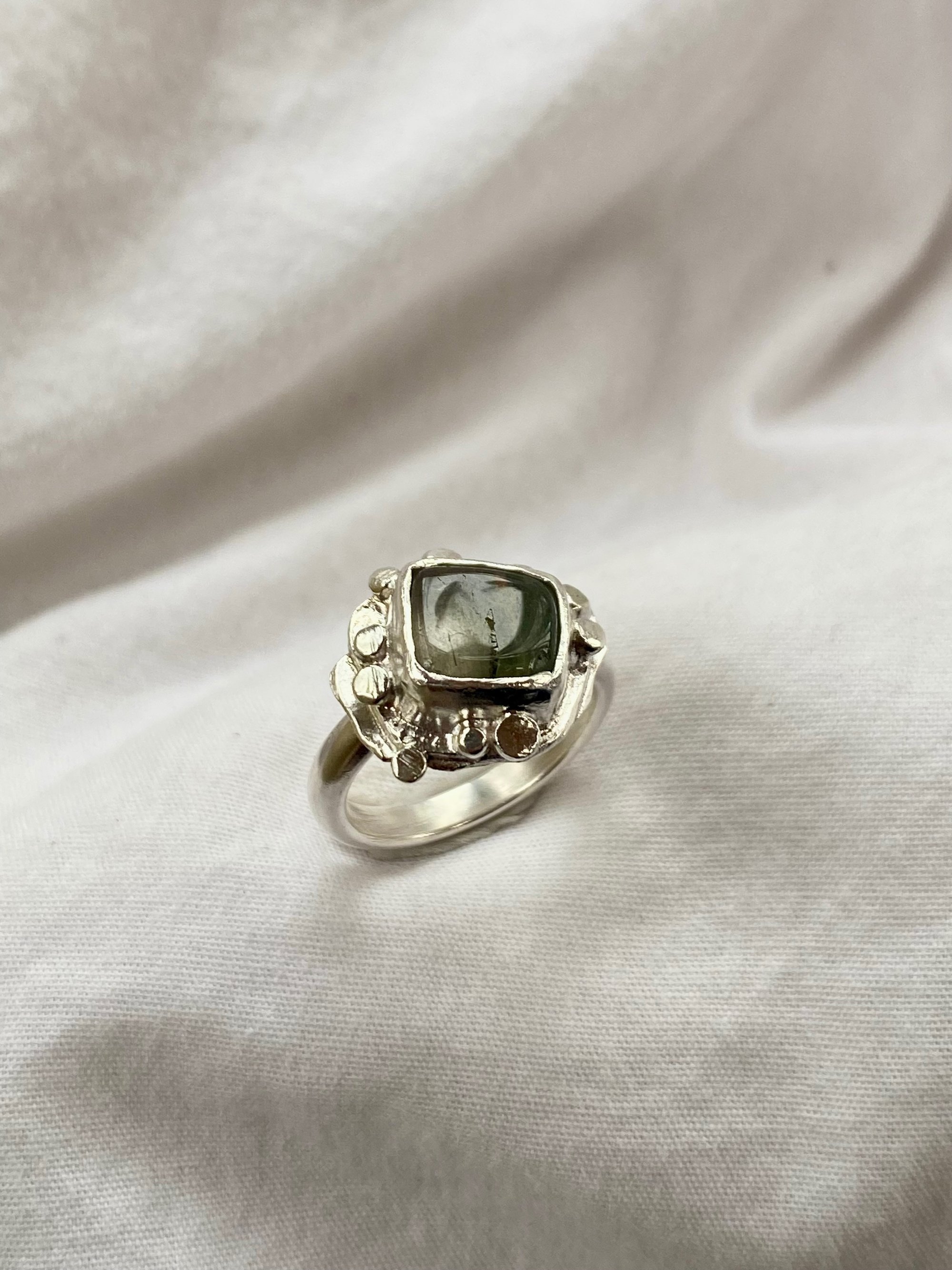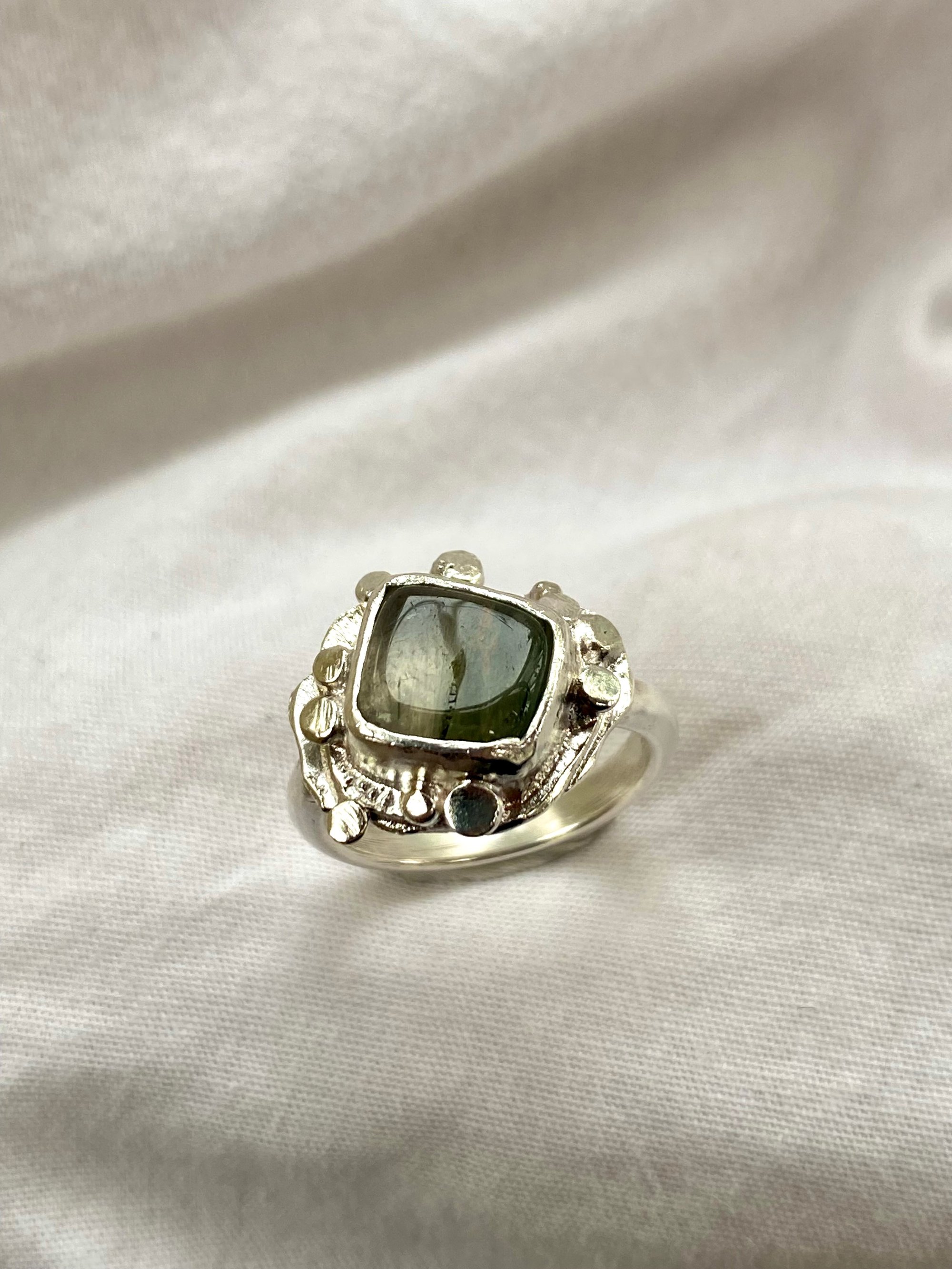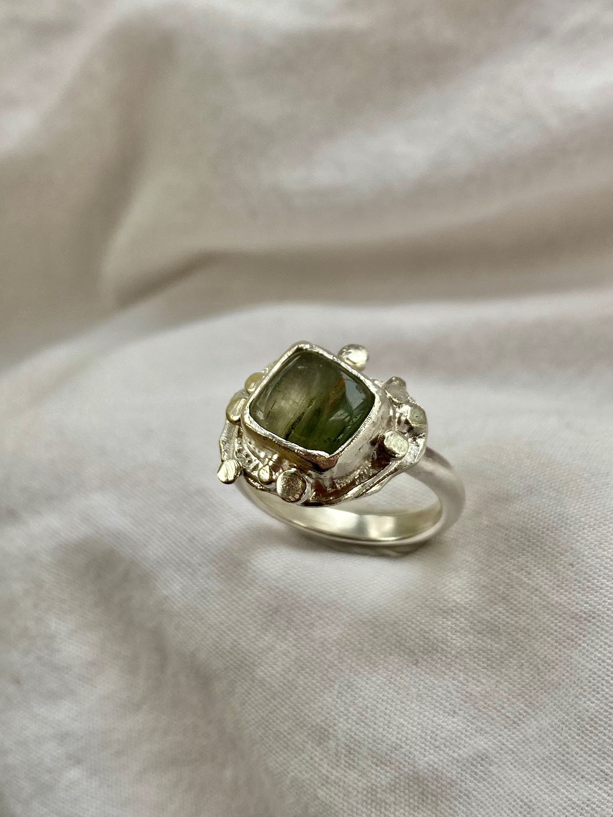One of a kind peridot gemstone ring - bezelled in an ornate organic style surrounding.
