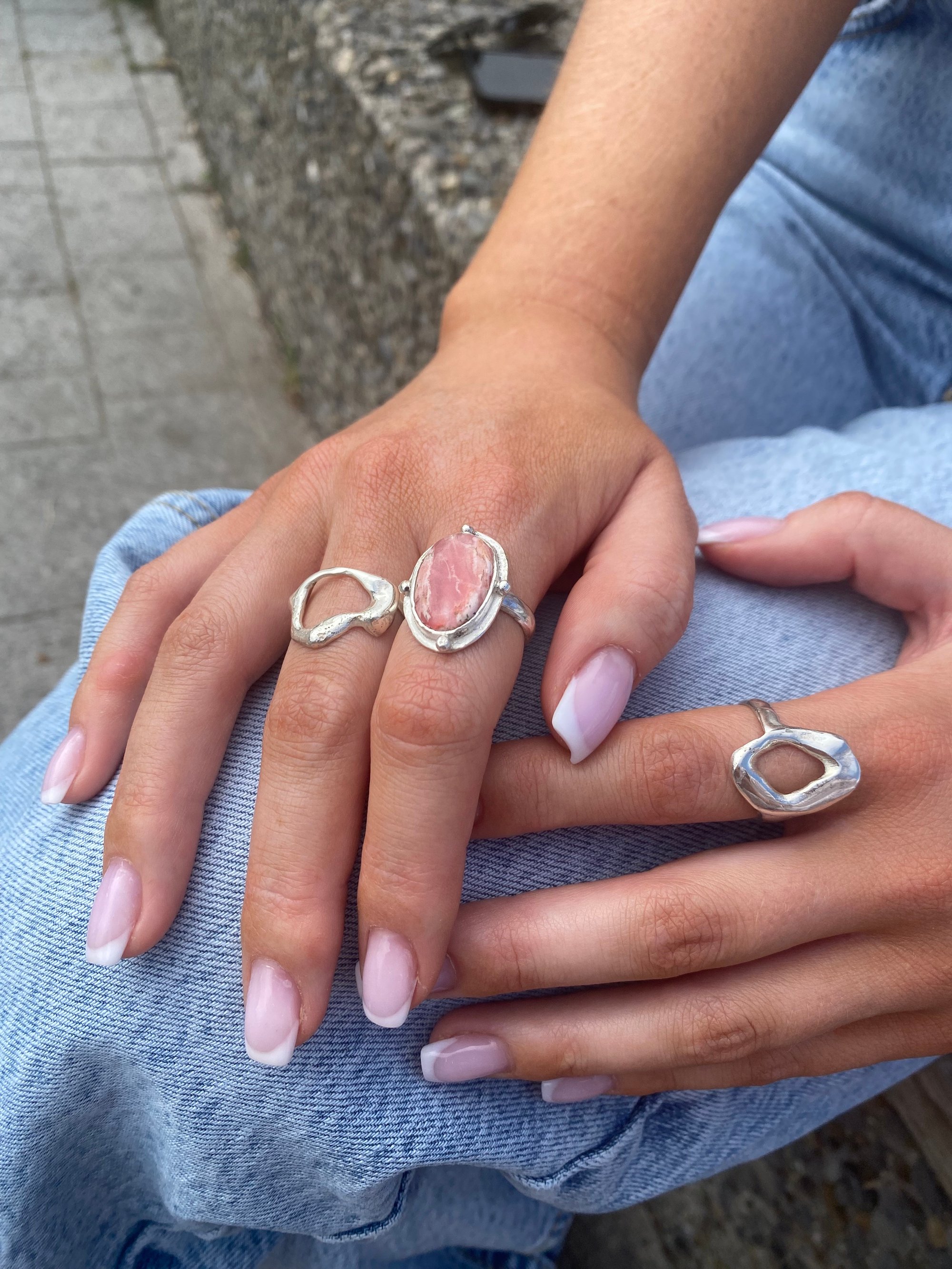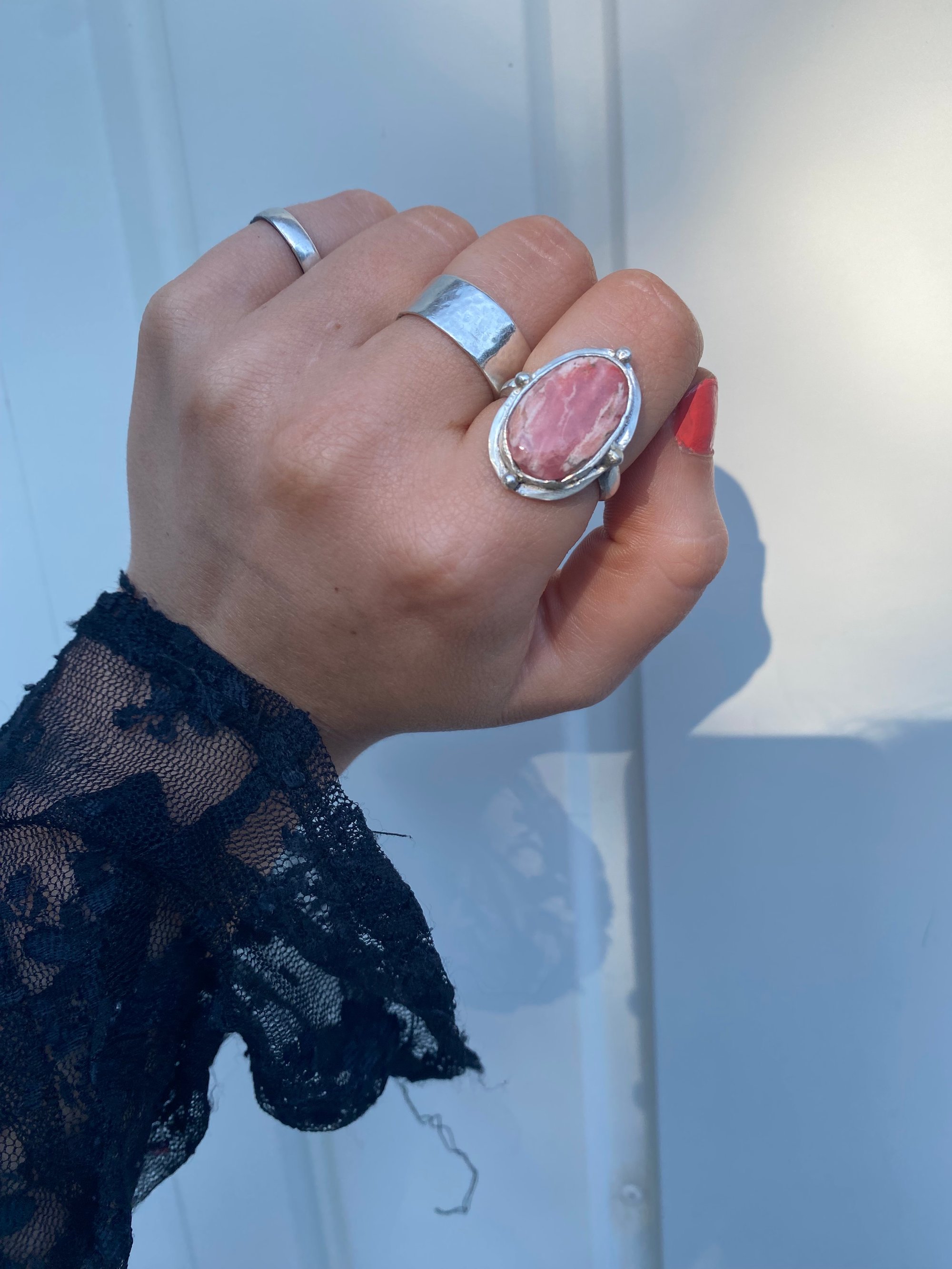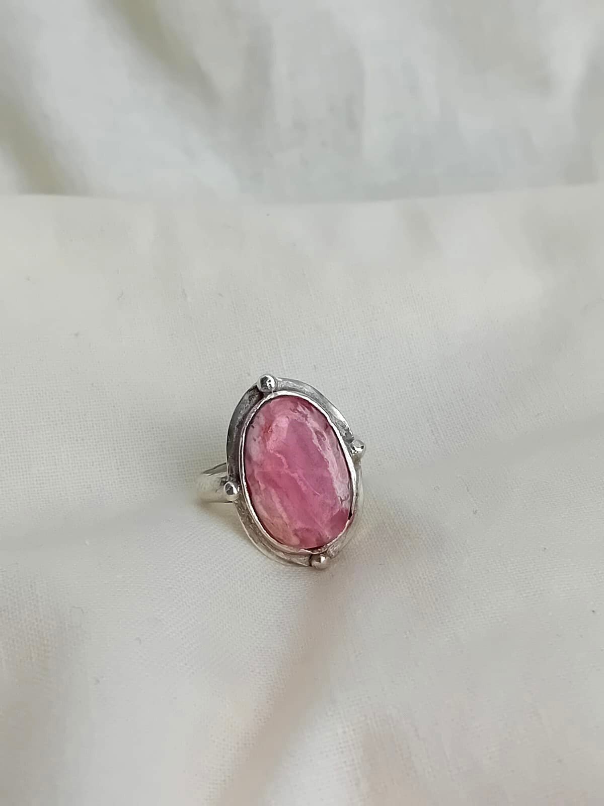 Size P handmade sterling silver Rhodochrosite healing gem stone ring. Four-dotted symmetrical bezel w/ silver balls soldered on.