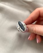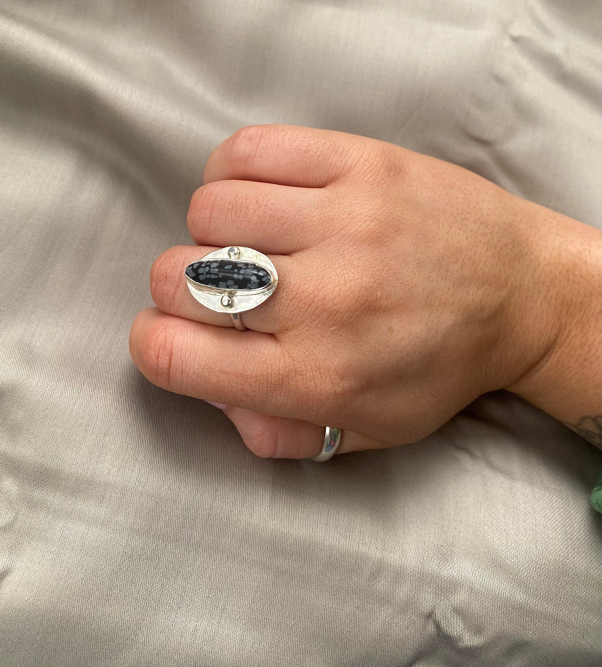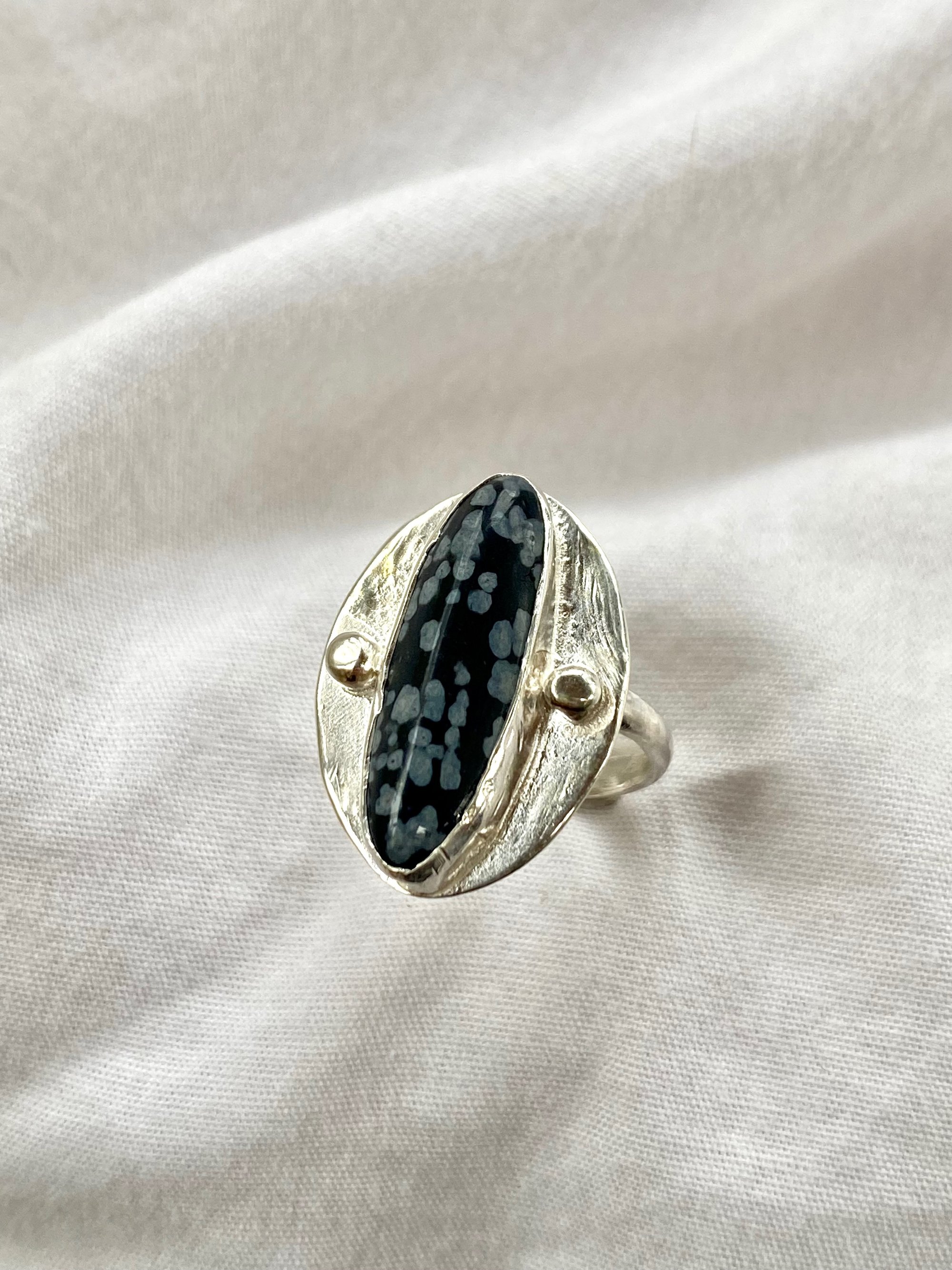 Snowflake Obsidian gemstone ring set in 925 sterling silver with open backplate