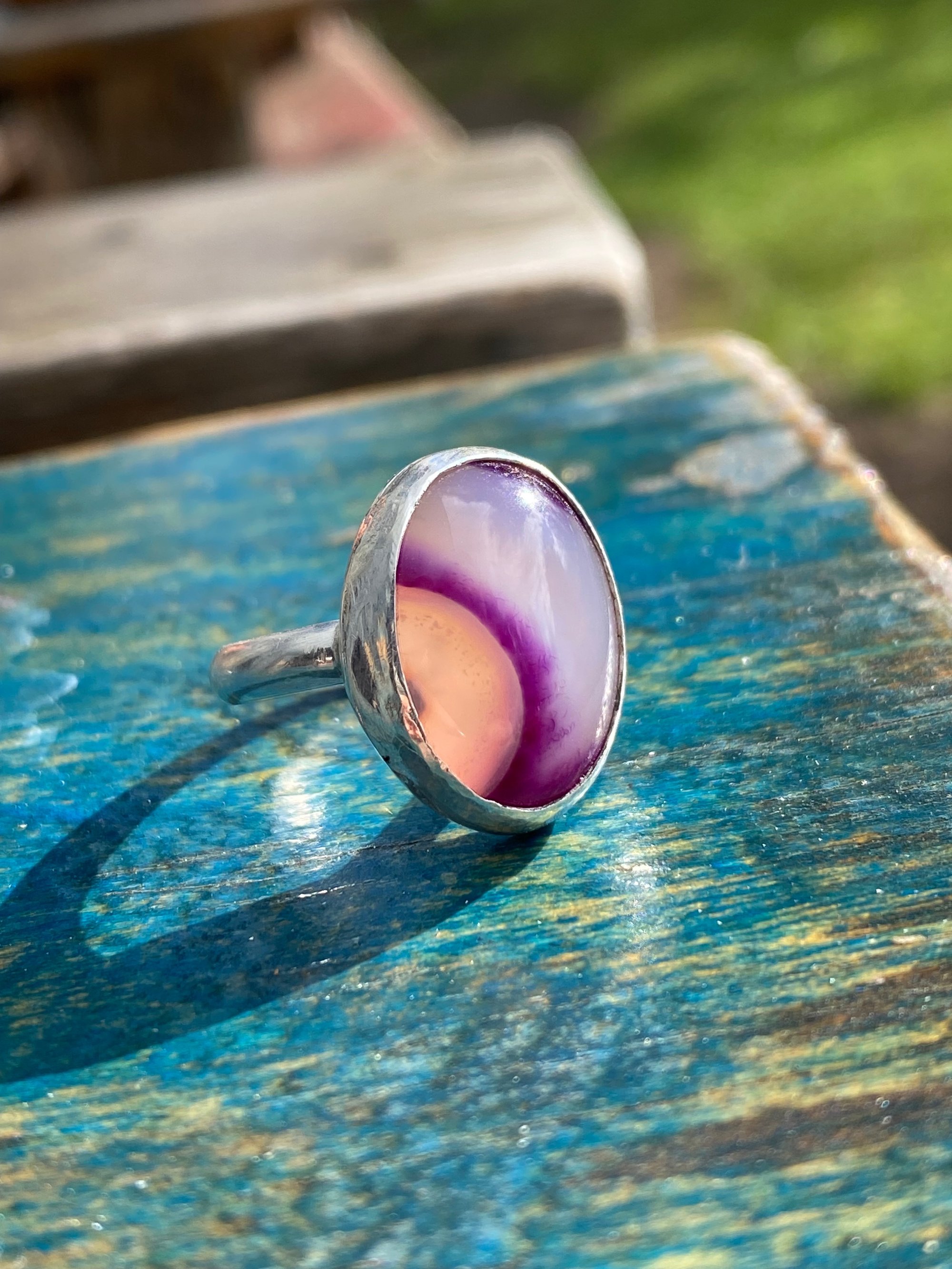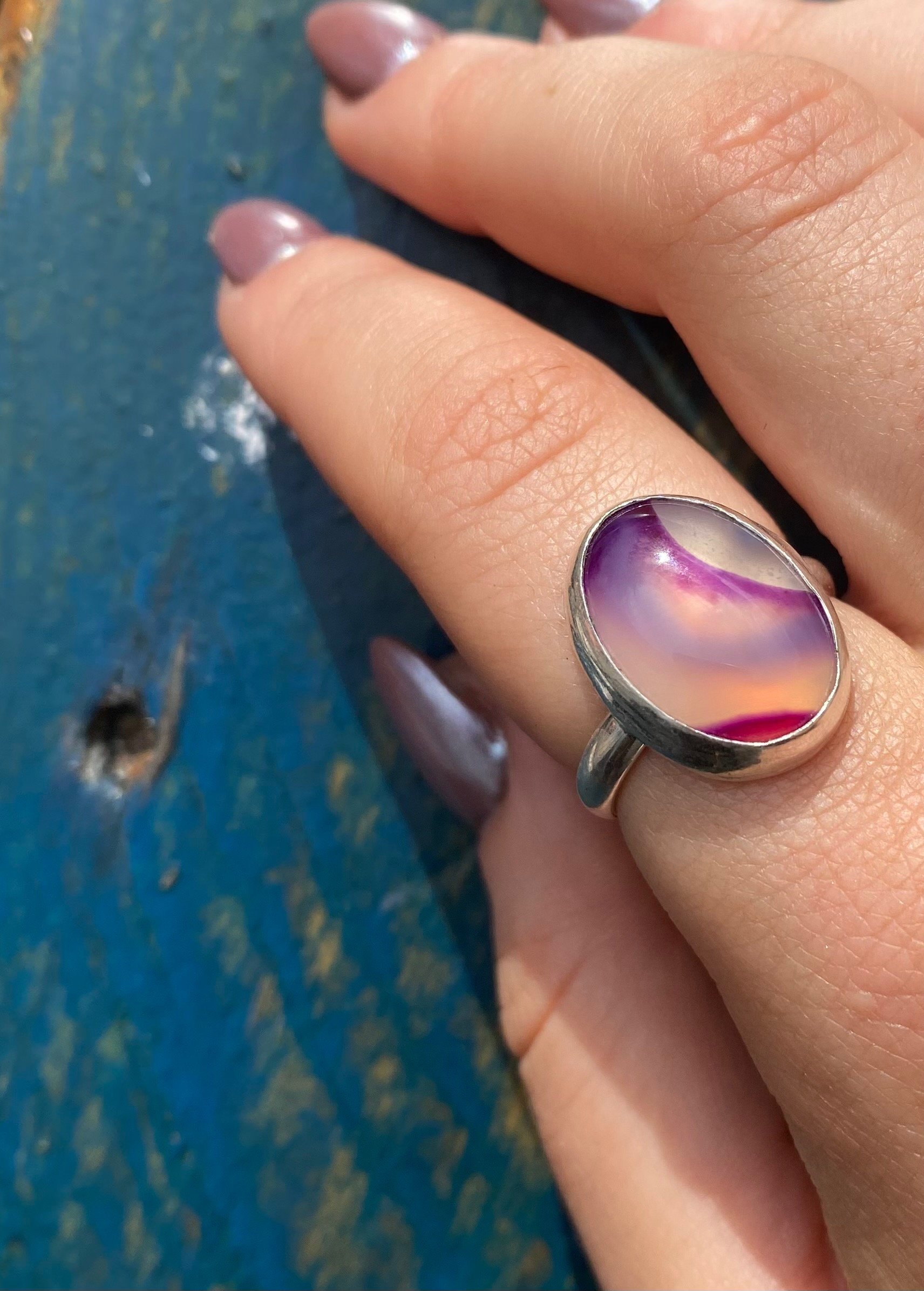 Handmade 925 sterling silver bezel set ring with a pink agate stone.