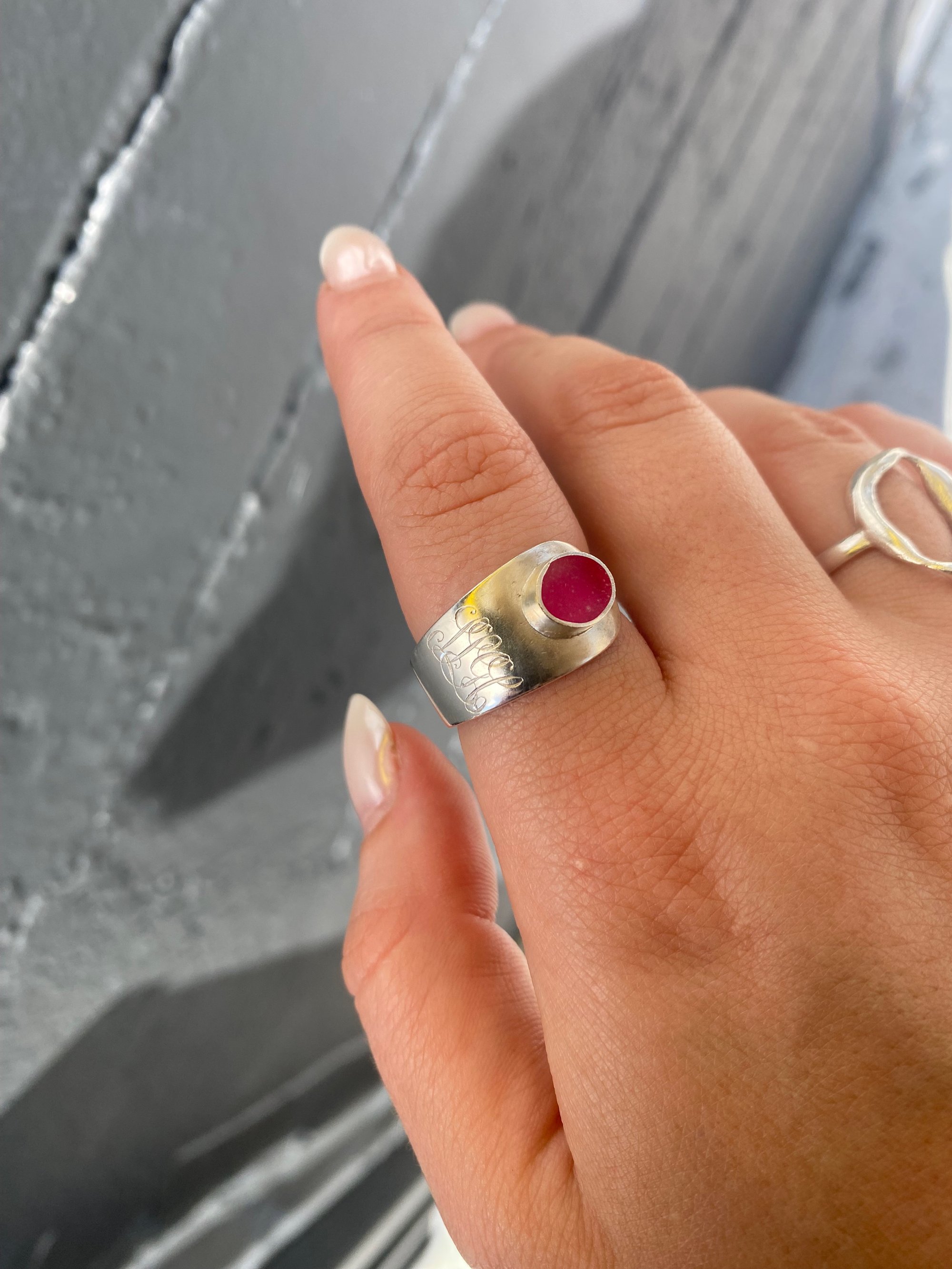 Upcycled 925 antique spoon ring w/ resin and pink enamel filled bezel. Scripture engraving 'LLL' on the exterior.