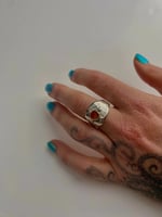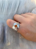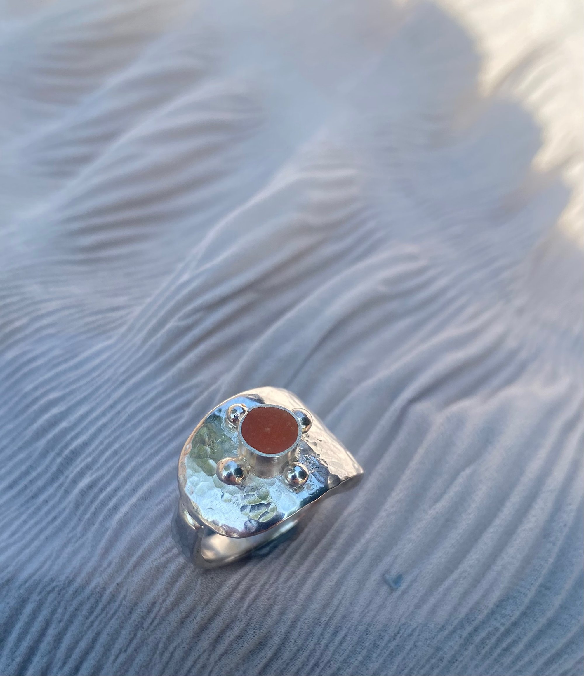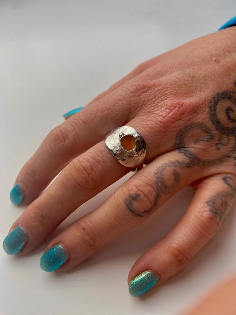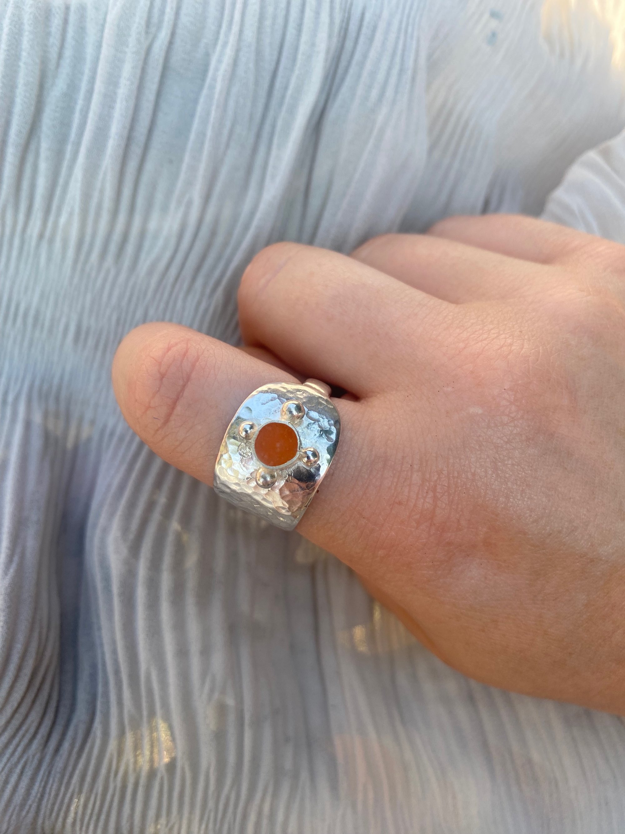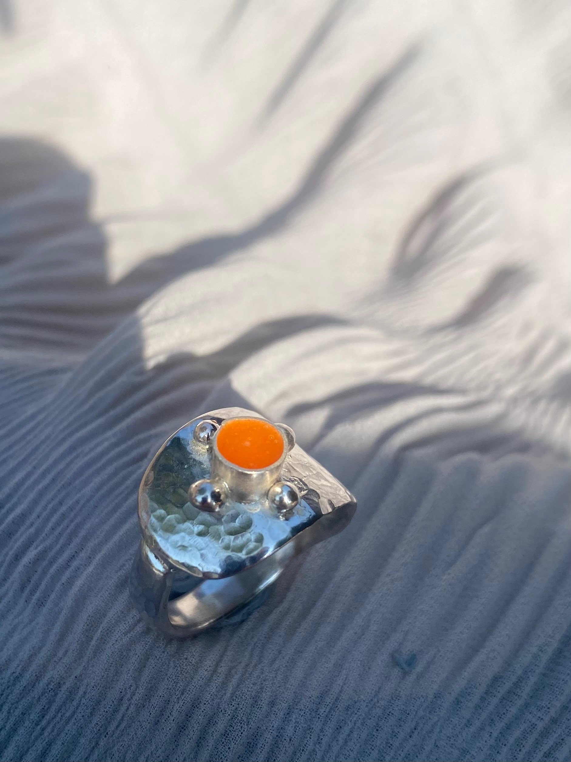 Up-cycled vintage 925 sterling silver spoon ring w/ orange enamel filled bezel.